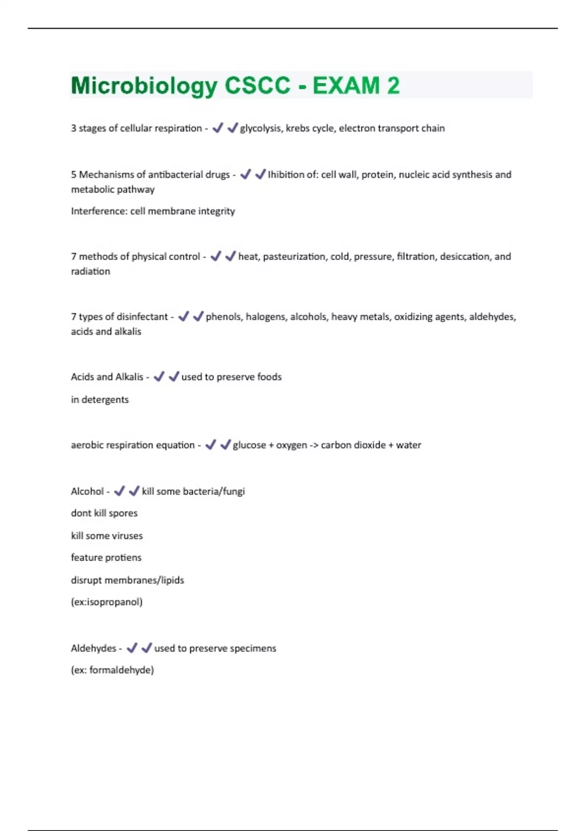 3 stages of cellular respiration - glycolysis, krebs cycle, electron transport chain 5 Mechanisms of antibacterial drugs - Ihibition of: cell wall, protein, nucleic acid synthesis and metabolic pathway Interference: cell membrane integrity 7 methods of physical control - heat, pasteurization, cold, pressure, filtration, desiccation, and radiation 7 types of disinfectant - phenols, halogens, alcohols, heavy metals, oxidizing agents, aldehydes, acids and alkalis Acids and Alkalis - used to preserve foods in detergents aerobic respiration equation - glucose + oxygen -> carbon dioxide + water Alcohol - kill some bacteria/fungi dont kill spores kill some viruses feature protiens disrupt membranes/lipids (ex:isopropanol) Aldehydes - used to preserve specimens (ex: formaldehyde)Anabolism - building metabolic reactions Antibiotic - a drug used to inhibit/kill bacteria antibiotics come from - bacteria and some fungi Antiparastic Drugs - interfere with biosynthetic pathways of protozoan parasites or neuromuscular function of worms drugs: marolone antiseptic - used on living things used to kill/inhibit growth Antiviral drugs - target specific virus targets: viral uncaring, nucleoside analogs, non-nucleoside polymerase inhibitors, non-nucleoside reverse transcriptase, protease inhibitors and neuraminidase inhibitors Apoptosis - programmed cell death aseptic - control the environment and amount of contamination ATP - stores energy for the cel. is made by phosphorylating ADP ATP is a... - reducer autotrophs - Organisms that are able to make their own food through INORGANIC materials (take c from CO2) bacteria produce what when fermented? - acetic acid, lactic acid, propionic acid, and formic acidBacteriastatic - drug inhibits the growth of the bacteria Bactericidal - kills bacteria Basophils - rarest WBC involved with inflammation/allergies releases histamine/heparin broad spectrum antibiotics - affect a broad range of gram-positive or gram-negative bacteria best used if its a general bacteria infection can some antibiotics kill enzymes? - yes, if bacteria over grows the enzymes cant keep up with it Carbon - all organic compounds including lipids, proteins, carbs, and nucleic acids catabolic reactions - provide energy for the cell, energy is stored as ATP, and when the cell needs an anabolic reaction energy is available catabolism - "cat tearing something down" digestive metabolic reactions Cell wall synthesis disruption - occurs with: penicillin/bacitracin/cephalosporins and vancomycin usually targets gram + Cellular energy - ATP Chemoautotrophs - An organism that needs only carbon dioxide as a carbon source but that obtains energy by oxidizing inorganic substances.Chemoheterotrophs - An organism that must consume organic molecules for both energy and carbon. Chemolithotrophs - use chemotrophs compounds as the carbon source and then are autotrophic using sunlight and other energy Chemoorganotrophs - use a variety of organic compounds as the carbon source and the energy source Chemotrophs - obtain energy from chemicals CHNOPS - Carbon, Hydrogen, Nitrogen, Oxygen, Phosphorus, Sulfur -needed to live cold temperature - inhibits microbial growth (refrigeration, deep freezing, lyophilization) Competitive inhibition of enzymes - occurs with sulfanilsmides they inhibit the enzyme that converts PABA to folic acid