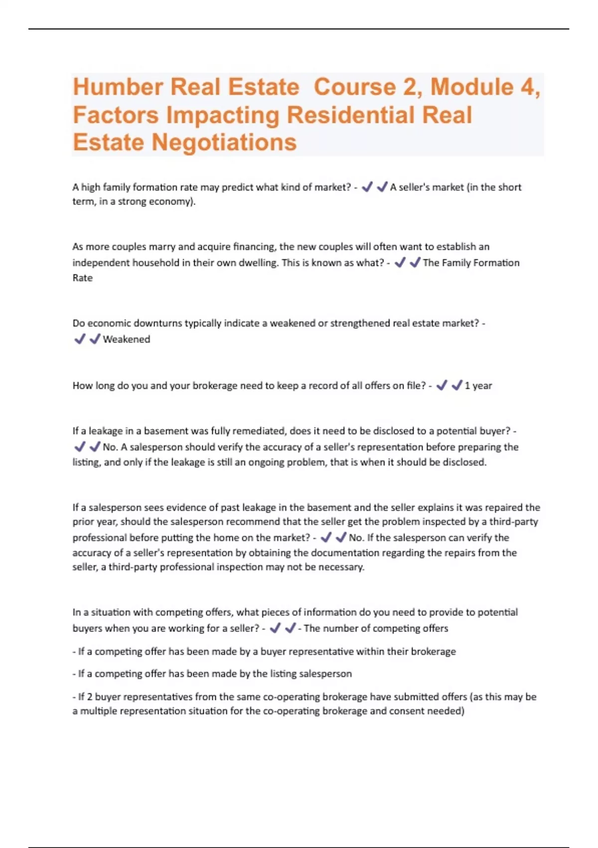 Humber Real Estate Course 2, Module 4, Factors Impacting Residential Real Estate Negotiations Questions and Answers with complete solution