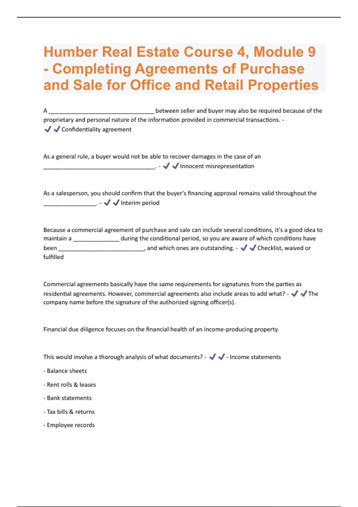 Humber Real Estate Course 4, Module 9 - Completing Agreements of Purchase and Sale for Office and Retail Properties Questions And Answers Rated A+