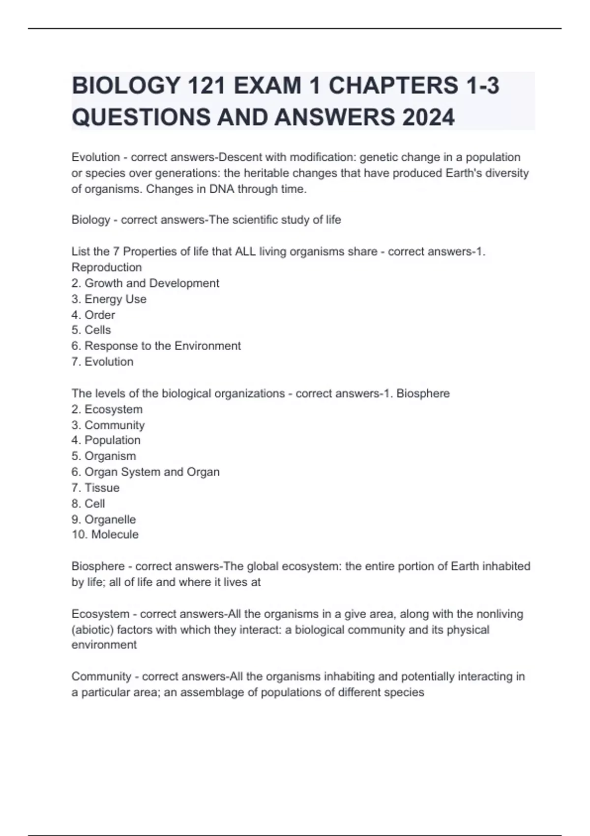 BIOLOGY 121 EXAM 1 CHAPTERS 1-3 QUESTIONS AND ANSWERS 2024