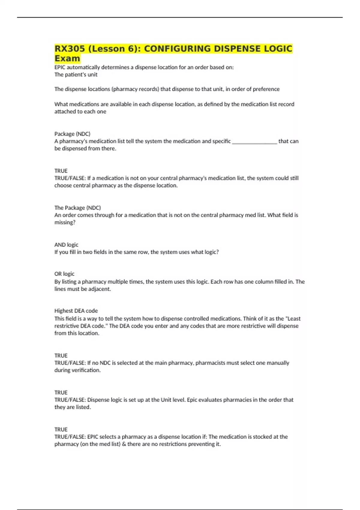 TRUE/FALSE: Dispense logic is set up at the Unit level. Epic evaluates pharmacies in the order that