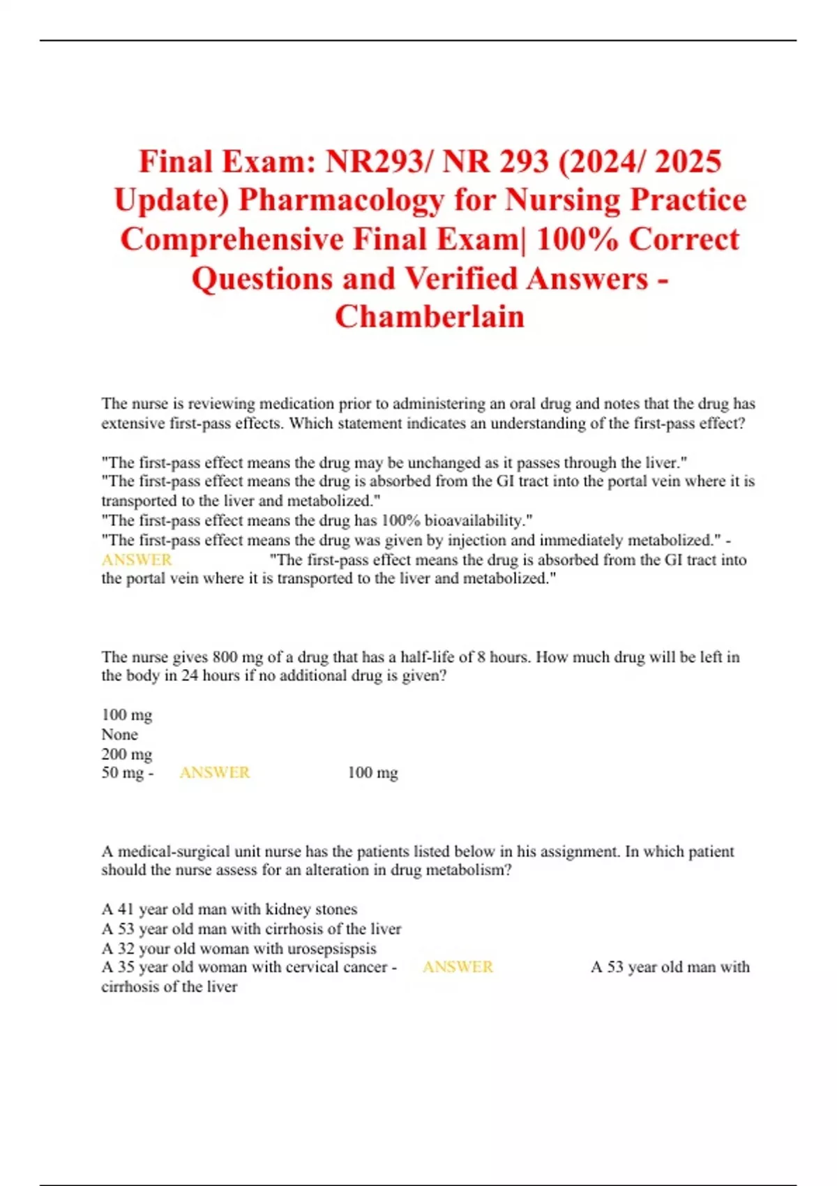 Final Exam: NR293/ NR 293 (2024/ 2025 Update) Pharmacology for Nursing Practice Comprehensive Final Exam| 100% Correct Questions and Verified Answers -Chamberlain