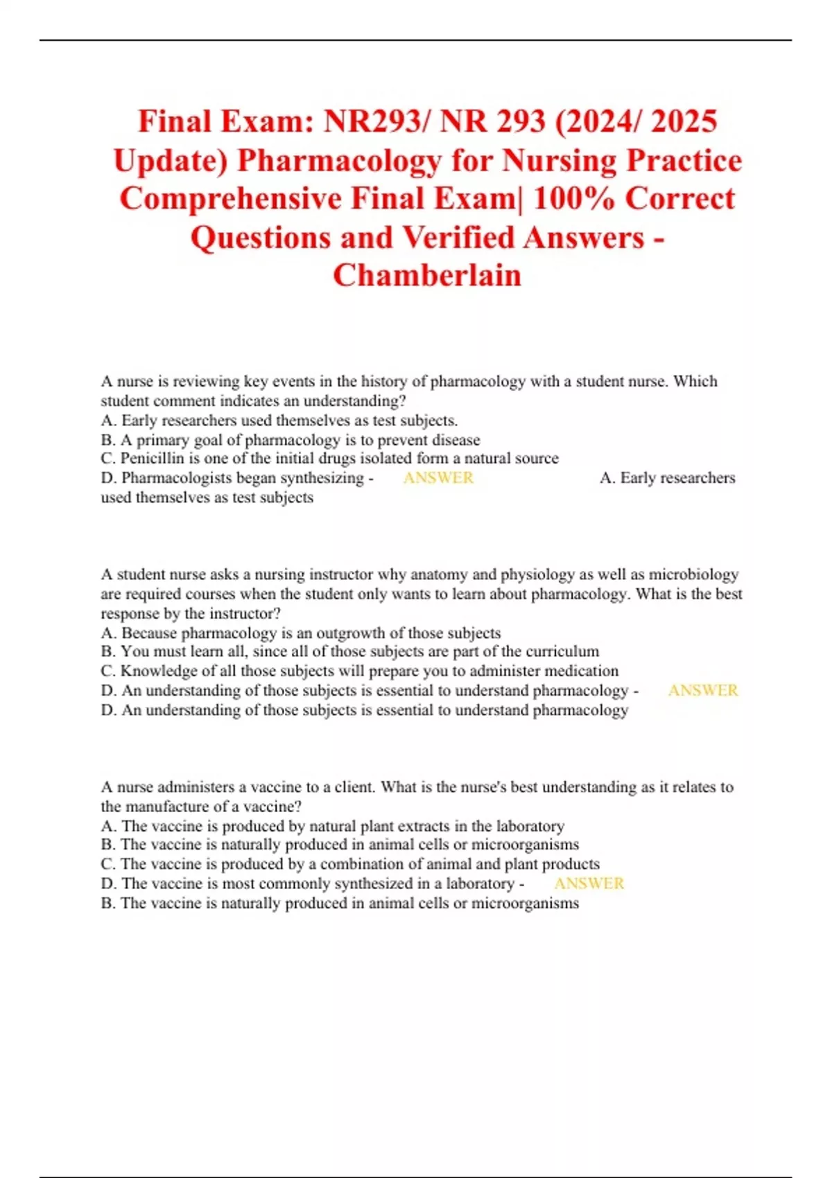 Final Exam: NR293/ NR 293 (2024/ 2025 Update) Pharmacology for Nursing Practice Comprehensive Final Exam| 100% Correct Questions and Verified Answers -Chamberlain