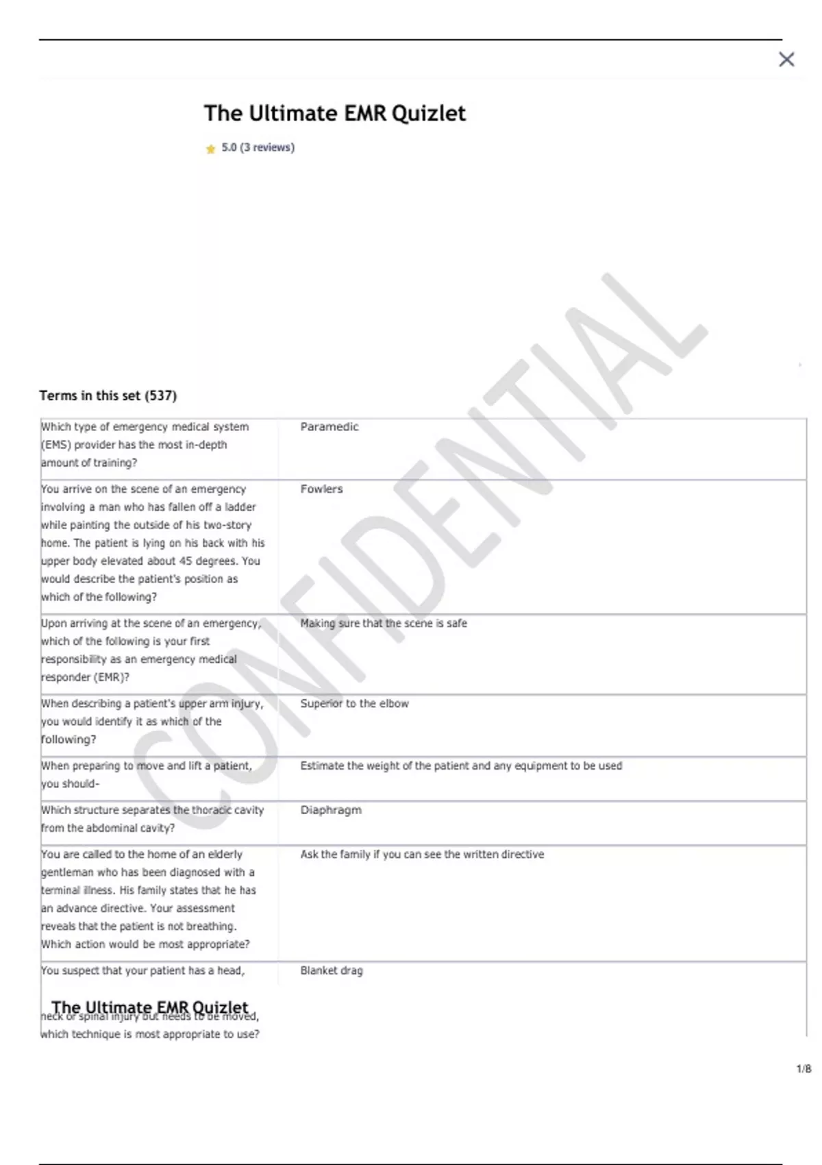 1/8 neck or spinal injury but needs to be moved, which technique is most appropriate to use? The Ultimate EMR Quizlet 5.0 (3 reviews) Terms in this set (537) Which type of emergency medical system (EMS) provider has the most in-depth amount of training? Paramedic You arrive on the scene of an emergency involving a man who has fallen off a ladder while painting the outside of his two -story home. The patient is lying on his back with his upper body elevated about 45 degrees. You would describe the patient's position as which of the following? Fowlers Upon arriving at the scene of an emergency, which of the following is your first responsibility as an emergency medical responder (EMR)? Making sure that the scene is safe When describing a patient's upper arm injury, you would identify it as which of the following? Superior to the elbow When preparing to move and lift a patient, you should - Estimate the weight of the patient and any equipment to be used Which structure separates the thoracic cavity from the abdominal cavity? Diaphragm You are called to the home of an elderly gentleman who has been diagnosed with a terminal illness. His family states that he has an advance directive. Your assessment reveals that the patient is not breathing. Which action would be most appropriate? Ask the family if you can see the written directive You suspect that your patient has a head, Blanket drag The Ultimate EMR Quizlet 6/29/24, 3:44 PM 2/8 You and three other responders are preparing to log roll a patient. The person at which position would direct the move? Head While providing care to a patient, some of the patient's body fluids inadvertently splash in into your eyes. Which of the following should you do first? Flush your eyes with clean water, saline or sterile irrigant for 20 minutes A patient has sustained a broken collarbone. You identify this bone as which of the following? Clavicle The following are statements that reflect the steps in obtaining consent from a patient. Which statement would you use first? My name is Jane Smith. A patient is lying face -down on floor in what appears to be a puddle of urine. There is blood oozing from a cut on her forehead. When providing care to his patient, which personal protective equipment (PPE) would be essential to use? Disposable gloves While at the scene of an accident, you speak to the physician via radio to obtain permission for a procedure not included in the standing orders. This is an example of which type of medical control? Direct You and your partner arrive at the home of a patient who needs to be transported to medical facility. You plan to move the patient from the bed to the stretcher using the direct carry technique. You position the stretcher - At a right angle to the patient's bed Which of the following would be appropriate to do while caring for a patient who is an emancipated minor if the patient tell you that she is fine and does not want further care? Honor her refusal, following local policies for such situations The following are four nationally recognized levels of EMS training. Which level is most advanced? Paramedic When preparing to provide care to a patient, which of the following must you do first? Identify yourself to the patient You are preparing to transport a patient who weighs 700 lbs. Which type of stretcher would be most appropriate to use? Bariatric stretcher You are providing care to an adolescent female who is legally emancipated minor. The female has a 9- month old infant who needs medical care. The adolescent nods her head in response to your request to care for her infant. This is an example of: expressed consent The Ultimate EMR Quizlet