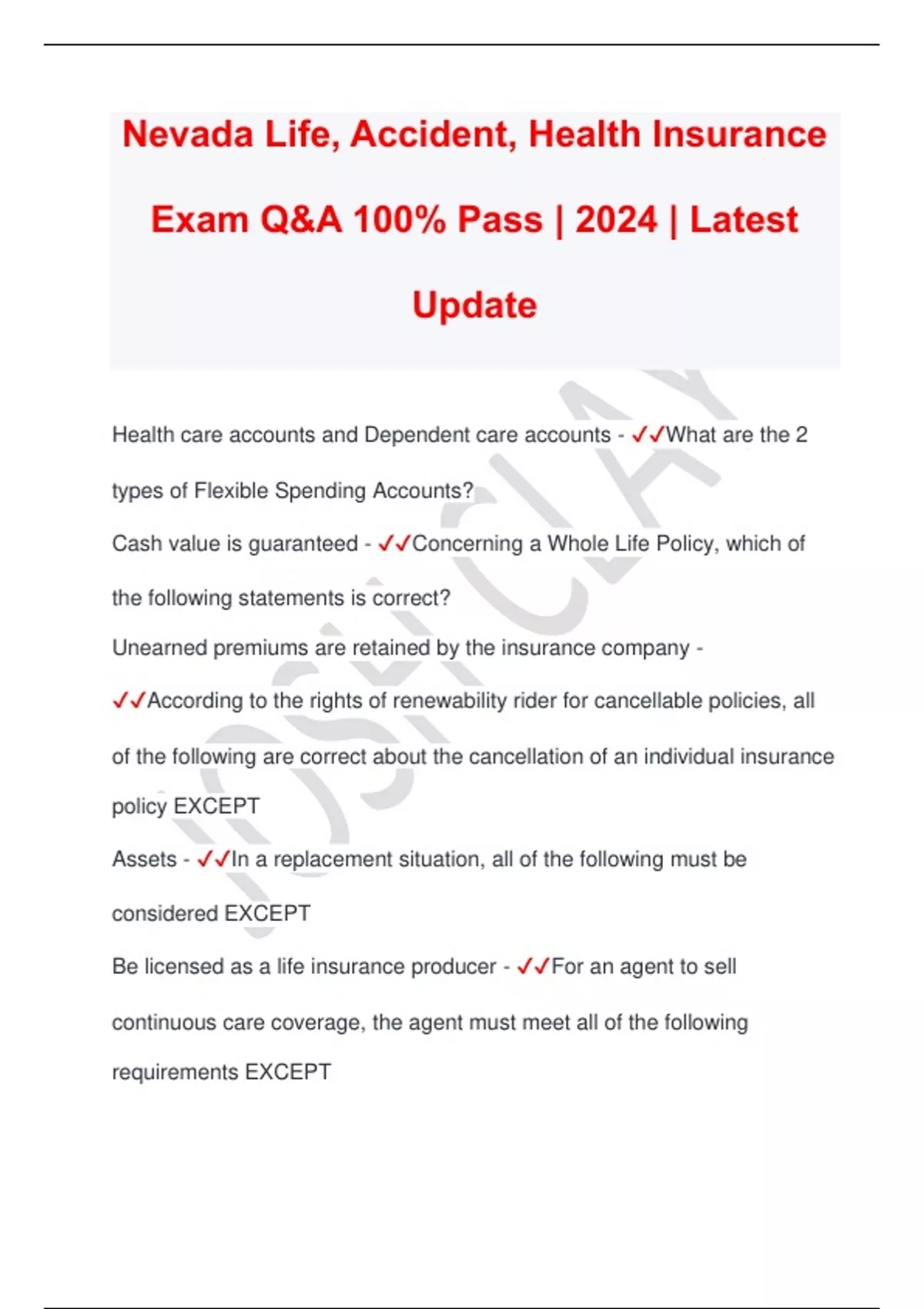 Nevada Life, Accident, Health Insurance Exam Q&A 100% Pass | 2024 | Latest Update Health care accounts and Dependent care accounts - What are the 2 types of Flexible Spending Accounts? Cash value is guaranteed - Concerning a Whole Life Policy, which of the following statements is correct? Unearned premiums are retained by the insurance company - According to the rights of renewability rider for cancellable policies, all of the following are correct about the cancellation of an individual insurance policy EXCEPT Assets - In a replacement situation, all of the following must be considered EXCEPT Be licensed as a life insurance producer - For an agent to sell continuous care coverage, the agent must meet all of the following requirements EXCEPT