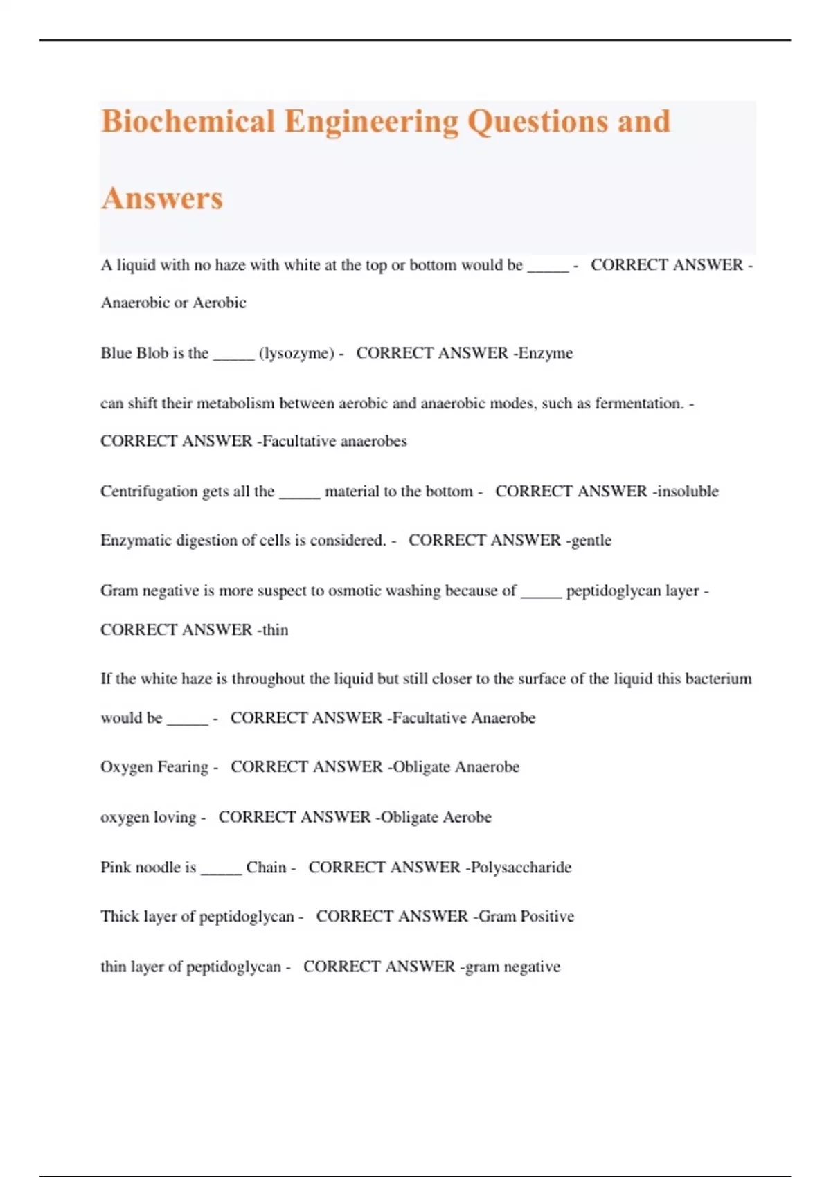 Biochemical Engineering Questions and Answers A liquid with no haze with white at the top or bottom would be _____ - CORRECT ANSWER - Anaerobic or Aerobic Blue Blob is the _____ (lysozyme) - CORRECT ANSWER -Enzyme can shift their metabolism between aerobic and anaerobic modes, such as fermentation. - CORRECT ANSWER -Facultative anaerobes Centrifugation gets all the _____ material to the bottom - CORRECT ANSWER -insoluble Enzymatic digestion of cells is considered. - CORRECT ANSWER -gentle Gram negative is more suspect to osmotic washing because of _____ peptidoglycan layer - CORRECT ANSWER -thin