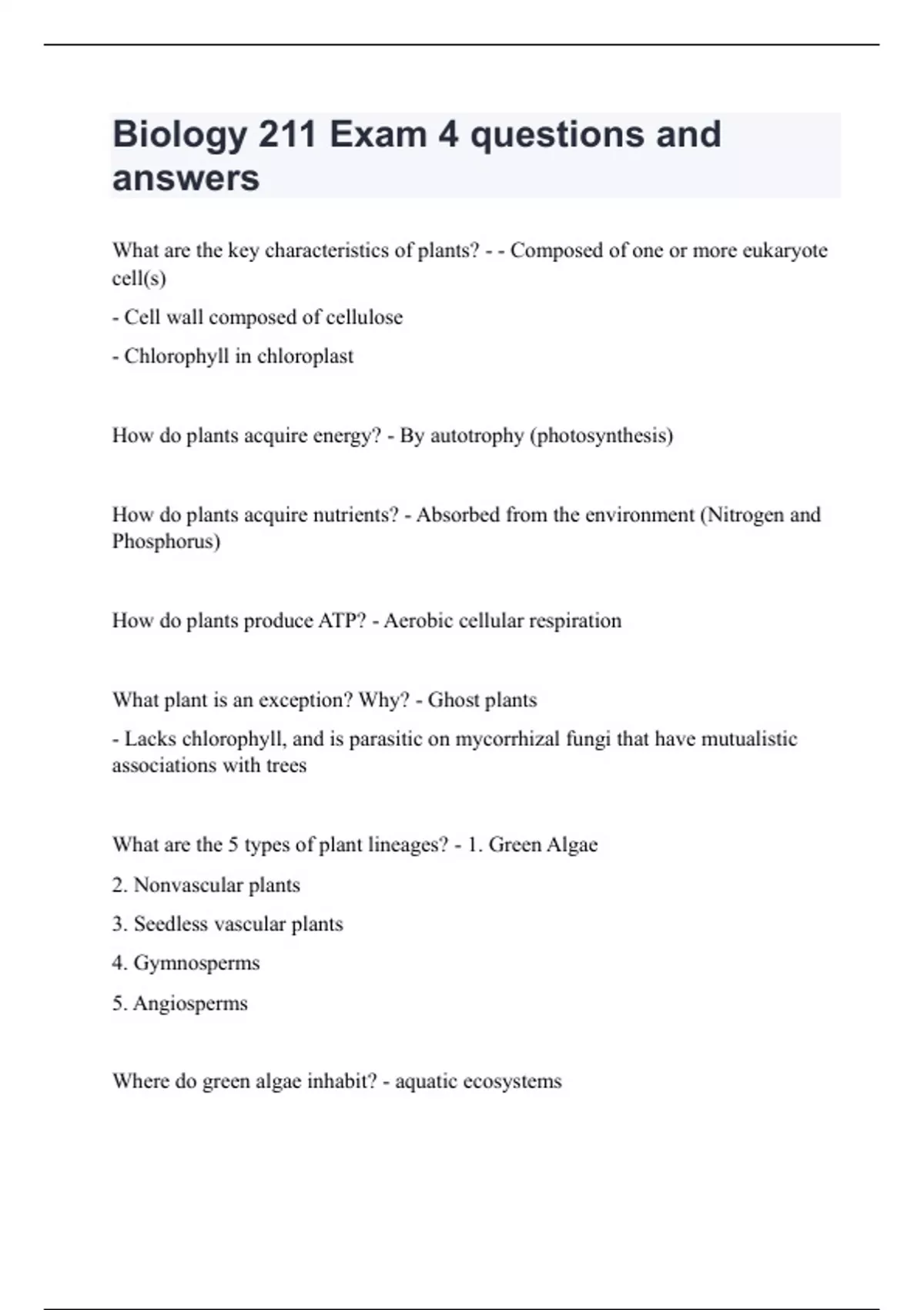 What are the key characteristics of plants? - - Composed of one or more eukaryote cell(s) - Cell wall composed of cellulose - Chlorophyll in chloroplast How do plants acquire energy? - By autotrophy (photosynthesis) How do plants acquire nutrients? - Absorbed from the environment (Nitrogen and Phosphorus) How do plants produce ATP? - Aerobic cellular respiration What plant is an exception? Why? - Ghost plants - Lacks chlorophyll, and is parasitic on mycorrhizal fungi that have mutualistic associations with trees What are the 5 types of plant lineages? - 1. Green Algae 2. Nonvascular plants 3. Seedless vascular plants 4. Gymnosperms 5. Angiosperms Where do green algae inhabit? - aquatic ecosystems What are the characteristics of green algae? - - Unicellular or multicellular - No tissues or organs How does green algae acquire nutrients and water? - - Carbon dioxide - Nitrogen - Phosphorus - Water absorbed across cell membrane What is the ecological importance (historically and presently) of green algae? - - Photosynthesis contributes to increased biological production and biodiversity in aquatic ecosystems All plant groups contribute to increased biodiversity by providing resources: a)______, b) _______, and c) _____ - a) food to consumers b) oxygen and c) habitat Where do non-vascular plants inhabit? - aquatic and terrestrial ecosystems What are the characteristics of non-vascular plants? - - Cells organized into tissues/organs - Cuticle and stomata - No vascular tissue - Embryo released from plant in a desiccation-resistant spore What is a waxy layer that prevents water loss from stems and leaves? - Cuticle What has pores that allow gas to exchange in photosynthetic tissues and guard cells close under conditions of water stress (to reduce further water loss)? - Stomata How do the cuticle and stomata acquire nutrients and water? - - Rhizoids anchor plant to substrate (e.g., soil, wood, rock) and absorb water, nutrients (N,P) - Carbon dioxide absorbed through stomata What is the ecological importance (historically) of the cuticle and stomata? - - Resources provided by first terrestrial plants enabled evolution of terrestrial consumers - Explosion in biodiversity, organism abundance, and biological production