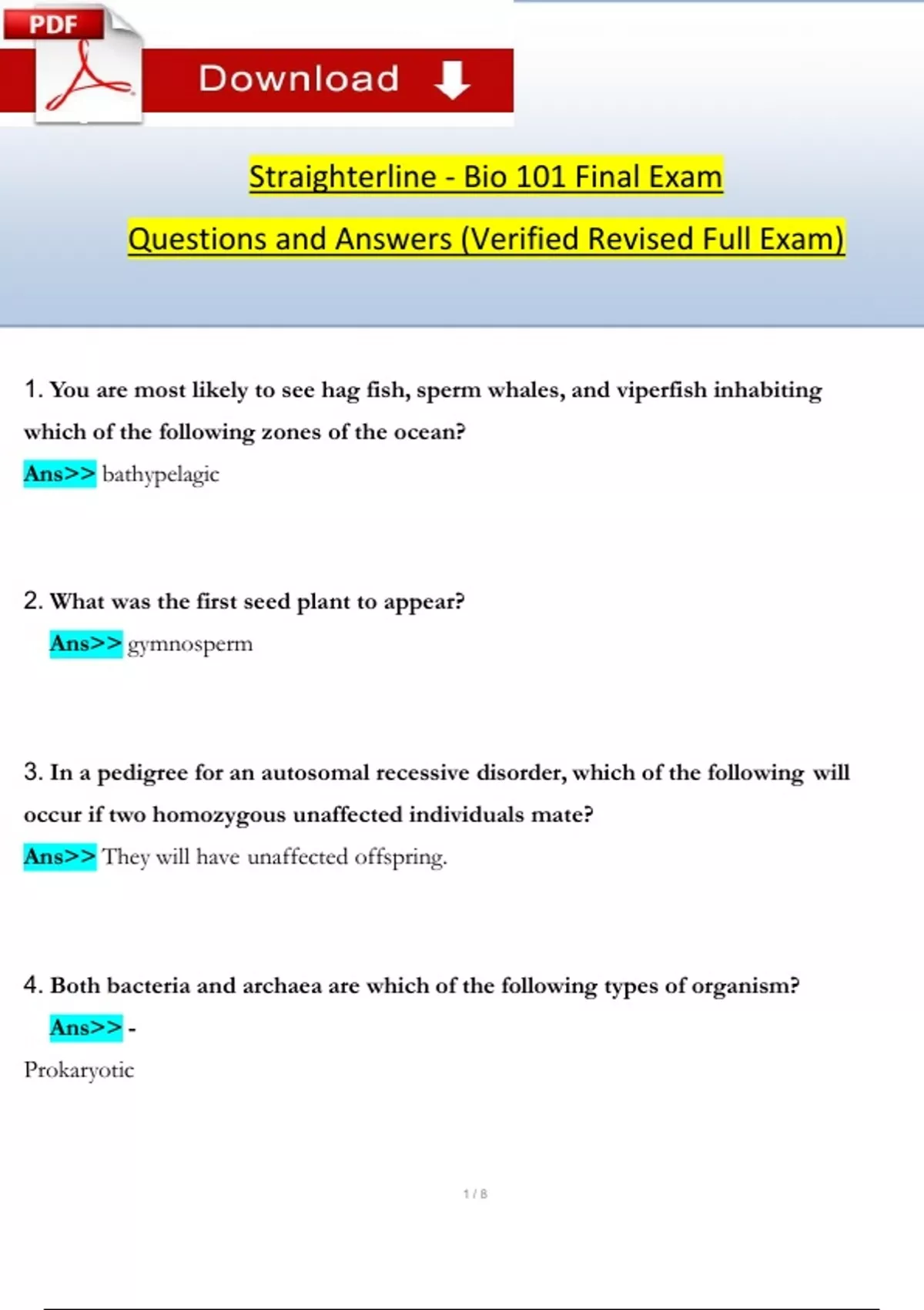 Straighterline - Bio 101 Final Exam Questions and Verified Answers (2024 / 2025) 100% Guarantee Pass