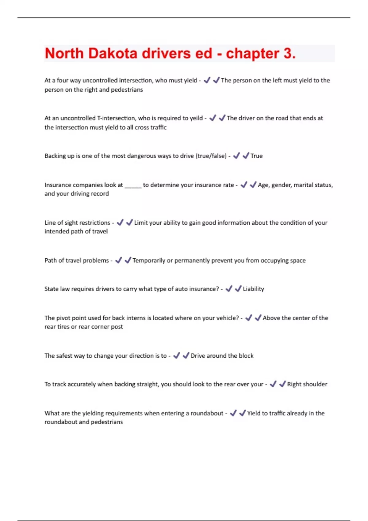 At a four way uncontrolled intersection, who must yield - The person on the left must yield to the person on the right and pedestrians At an uncontrolled T-intersection, who is required to yeild - The driver on the road that ends at the intersection must yield to all cross traffic Backing up is one of the most dangerous ways to drive (true/false) - True Insurance companies look at _____ to determine your insurance rate - Age, gender, marital status, and your driving record Line of sight restrictions - Limit your ability to gain good information about the condition of your intended path of travel Path of travel problems - Temporarily or permanently prevent you from occupying space State law requires drivers to carry what type of auto insurance? - Liability The pivot point used for back interns is located where on your vehicle? - Above the center of the rear tires or rear corner post The safest way to change your direction is to - Drive around the block To track accurately when backing straight, you should look to the rear over your - Right shoulder What are the yielding requirements when entering a roundabout - Yield to traffic already in the roundabout and pedestriansWhat is the safest turnabout maneuver - Taking three rights to make a left Whee should your central vision be focused when you are turning right - The target area When back your vehicle, you are required to yield to - All traffic, pedestrians, and bicyclists When performing a backing turn, you should target the rear by looking - Over your left shoulder to back to the left and your right shoulder to back to the right When turning left, you must yield to - All oncoming traffic until it is safe to turn Where is the legal stop location - Front bumper before the stop line and crosswalk Where is the safety stop location - The front bumper even with the curb line