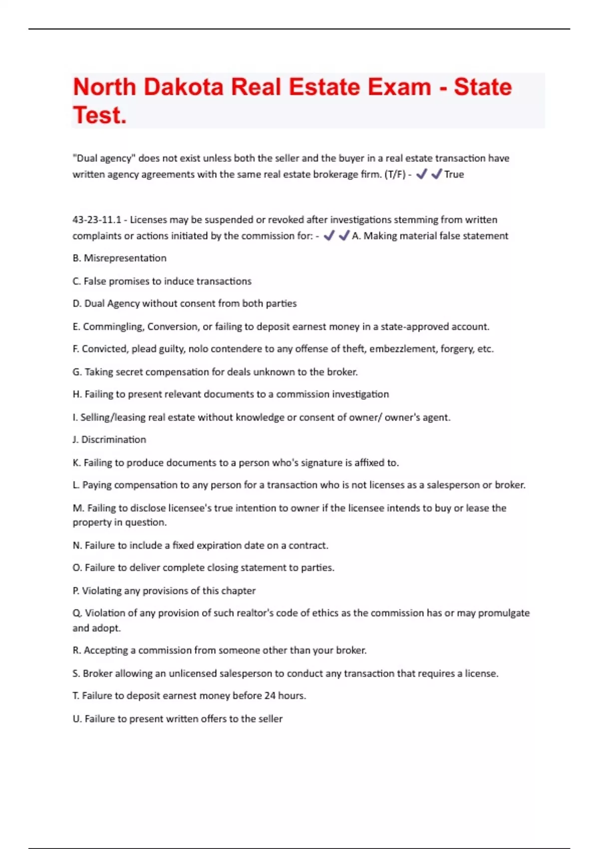 "Dual agency" does not exist unless both the seller and the buyer in a real estate transaction have written agency agreements with the same real estate brokerage firm. (T/F) - True 43-23-11.1 - Licenses may be suspended or revoked after investigations stemming from written complaints or actions initiated by the commission for: - A. Making material false statement B. Misrepresentation C. False promises to induce transactions D. Dual Agency without consent from both parties E. Commingling, Conversion, or failing to deposit earnest money in a state-approved account. F. Convicted, plead guilty, nolo contendere to any offense of theft, embezzlement, forgery, etc. G. Taking secret compensation for deals unknown to the broker. H. Failing to present relevant documents to a commission investigation I. Selling/leasing real estate without knowledge or consent of owner/ owner's agent. J. Discrimination K. Failing to produce documents to a person who's signature is affixed to. L. Paying compensation to any person for a transaction who is not licenses as a salesperson or broker. M. Failing to disclose licensee's true intention to owner if the licensee intends to buy or lease the property in question. N. Failure to include a fixed expiration date on a contract. O. Failure to deliver complete closing statement to parties. P. Violating any provisions of this chapter Q. Violation of any provision of such realtor's code of ethics as the commission has or may promulgate and adopt. R. Accepting a commission from someone other than your broker. S. Broker allowing an unlicensed salesperson to conduct any transaction that requires a license. T. Failure to deposit earnest money before 24 hours. U. Failure to present written offers to the sellerA broker applicant must successfully complete their required 60 hr course before taking the exam? (T/F) - True A broker is required to have and maintain a definite place of business in the state of North Dakota. (T/F) - True A broker's home may NOT qualify as a place of business (T/F) - False A fee for not more than what amount must accompany initial and annual license renewals? - $200 A letter of reprimand may be issued to a licensee form the commission without a formal hearing (T/F) - False A licensee is liable for any action resulting from any disclosure or nondisclosure relating to the registration of sexual offenders under section 12.1-32-15. (T/F) - False A nonresident broker regularly engaged in the real estate business as a vocation and who maintains a definite place of business and is licensed in some other state, which offers the same privileges to the licensed brokers of this state, may not be: - required to maintain a place of business within this state. A salesperson transferring from one employer to another must wait for the commission to issue a new license and it prohibited from conducting any real estate transactions until the new license is received. (T/F) - True After judging against an applicant in a hearing, the commission may direct the licensee to pay a fine not to exceed what amount, including attorney fees and other costs incurred by the commission in the case? - $2,500 All moneys or fees collected or received from the commission must be deposited and disbursed in accordance with which section? - 54-44-12an applicant for a broker's or salesperson's license must be at least how old? - eighteen years of age Applications for renewal must be submitted along with proof of CE and application fees before which date? - December 31 Commission shall maintain a balance how many dollars in the education fund for recovery purposes? - 60,000 Each licensee must be notified of the required terms and conditions of coverage at least how many days before the annual license renewal date? - 30 days For purposes of "dual agency" a subagency arrangement is a written agency agreement. (T/F) - False For which reasons may the commission exempt license renewal restrictions due to incomplete CE? - Licensee health, military service, or other "good" cause How many days after moving an office, must a broker notify the commission of their new address? - 10 days How many days notice must be given to the applicant of such a hearing to produce evidence related to the hearing? - 20 days How many of the commissions members must be active brokers - 3 How many years must have passed after another state revoked a RE license, can a a license or license renewal be issued? - 2 yearsHow may a broker applicant be able to obtain a broker license without two years salesperson experience? - Have two years of substantially equal experience to be determined by the real estate commission. If a brokerage firm, through a designated broker appoints a licensee within the brokerage to represent a client, the brokerage is still in dual agency with that client if another agent brings them a buyer/listing. (T/F) - False If a licensee has written buyer agreements with two or more different clients who wish to make a written offer on the same property, the licensee doesn't have to disclose to the clients that there are other written offers from clients he/she represents. (T/F) - False