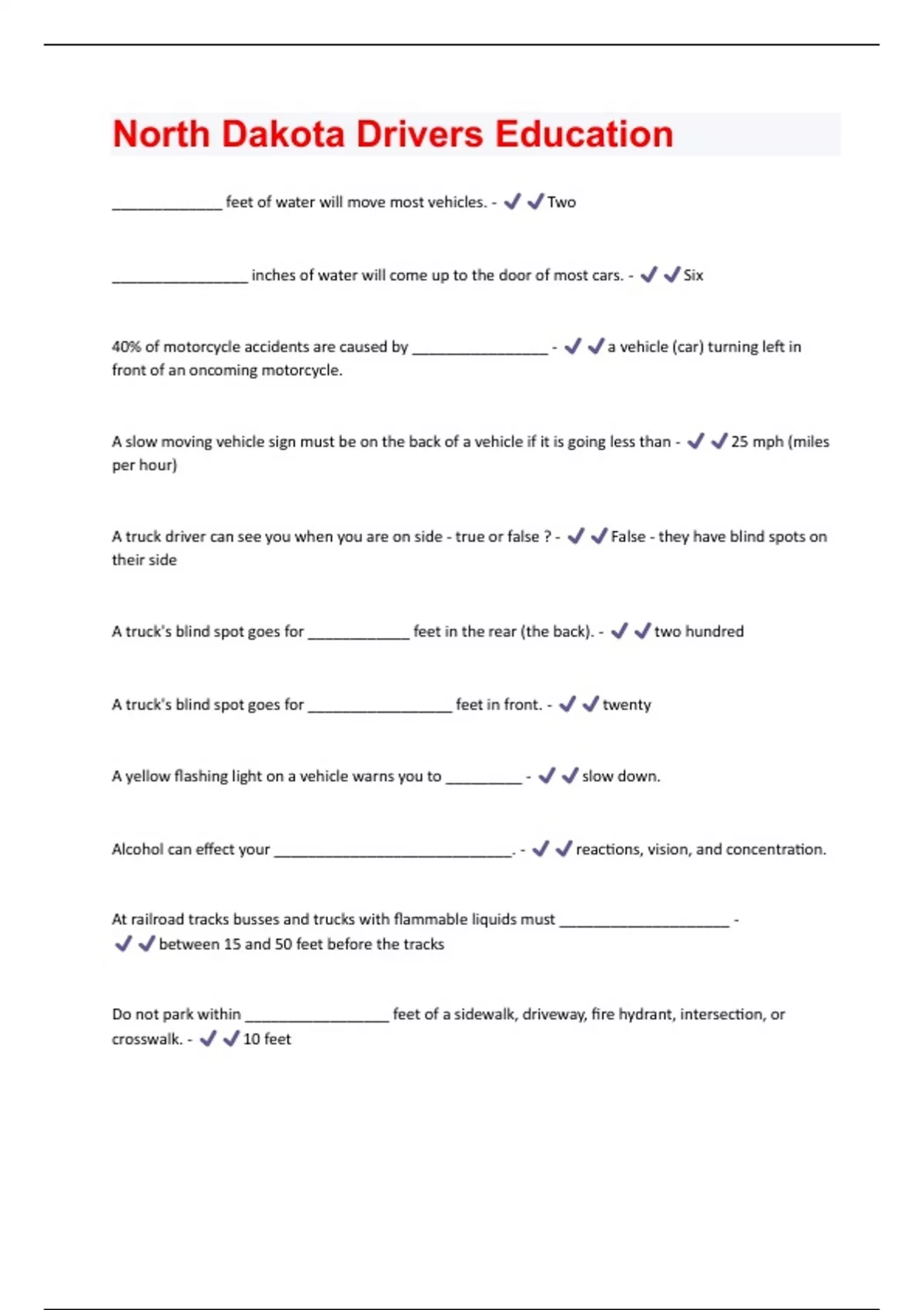 _____________ feet of water will move most vehicles. - Two ________________ inches of water will come up to the door of most cars. - Six 40% of motorcycle accidents are caused by ________________ - a vehicle (car) turning left in front of an oncoming motorcycle. A slow moving vehicle sign must be on the back of a vehicle if it is going less than - 25 mph (miles per hour) A truck driver can see you when you are on side - true or false ? - False - they have blind spots on their side A truck's blind spot goes for ____________ feet in the rear (the back). - two hundred A truck's blind spot goes for _________________ feet in front. - twenty A yellow flashing light on a vehicle warns you to _________ - slow down. Alcohol can effect your ____________________________. - reactions, vision, and concentration. At railroad tracks busses and trucks with flammable liquids must ____________________ - between 15 and 50 feet before the tracks Do not park within _________________ feet of a sidewalk, driveway, fire hydrant, intersection, or crosswalk. - 10 feetDo not park within __________________ feet of a beacon on the side of the road. - 15 Every vehicle must have a mirror that allows the driver to see ____________ to the rear (back). - 200 How many feet does it take you to stop if you are going 55 miles per hour - 300 feet or about one city block How many lanes should you change at a time ? - One How many points do you need to have before your license is suspended (taken away) ? - Twelve How many points do you start out with on your license ? - Zero How many seconds should you be behind a vehicle in front of you on a highway ? - Three seconds If an emergency vehicle, law enforcement, or highway vehicle is on the side of the road you should _________ - move to the other lane and proceed with caution. If leaving a parking lot, alley, or driveway to go onto a street you must come to a ___________________________ before proceeding - complete stop If skidding in a rear wheel drive vehicle you should________ - turn your wheels in the direction the back of the car is skidding. If the rear tire blows the car will - sway back and forth. If you get a flat tire you should _____ - ease up on the accelerator (slow down) and steer straight aheadIf you see an emergency vehicle approaching you need to ______________________ - pull over to the right side of the road If your front tire blows (goes flat) the car will pull _______ - in the direction of the blown tire In a car with anti-lock breaks you should _________ to avoid skidding on ice. - hold the breaks down with firm and continues pressure. In a front wheel drive car if you are skidding you should ___________________ - accelerate slightly and steer in the direction you want to go. In skid with a car with regular drum breaks you should _________ - Pump your breaks and do not slam on the breaks. More than ______________________ injuries occur every year (annually) in work zones - 25,000 Motorcycles and bicycles are easily seen when they are next to you - true or false ? - False - they are easily hidden in your blind spots Never pass when you are within _________ feet of an intersection, tunnel, or railroad crossing. - 100 Never pass within feet of an intersection, a railroad crossing, or a tunnel. - 100 Speed limit signs tell how fast you can go in ________ conditions ? - ideal (good) Trailer lights must be able to be seen (visible) for _________________ feet - 1000 What does proceed mean - To go forwardWhat does right of way mean - That the other driver has the right to go first What does the word oncoming traffic mean ? - Traffic that is coming towards you What does yield mean - Slow down, stop if necessary, and wait for the other traffic to pass What is the fine for speeding in a work zone - $80 What is the speed limit in residential areas ? - 25 miles per hour What is the speed limit on a gravel road ? - 55 miles per hour