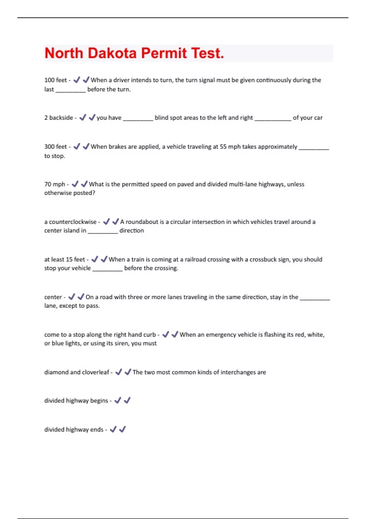 100 feet - When a driver intends to turn, the turn signal must be given continuously during the last _________ before the turn. 2 backside - you have _________ blind spot areas to the left and right ___________ of your car 300 feet - When brakes are applied, a vehicle traveling at 55 mph takes approximately _________ to stop. 70 mph - What is the permitted speed on paved and divided multi-lane highways, unless otherwise posted? a counterclockwise - A roundabout is a circular intersection in which vehicles travel around a center island in _________ direction at least 15 feet - When a train is coming at a railroad crossing with a crossbuck sign, you should stop your vehicle _________ before the crossing. center - On a road with three or more lanes traveling in the same direction, stay in the _________ lane, except to pass. come to a stop along the right hand curb - When an emergency vehicle is flashing its red, white, or blue lights, or using its siren, you must diamond and cloverleaf - The two most common kinds of interchanges are divided highway begins - divided highway ends -farthest left - On multilane roads, the _________ lane is intended to be used for passing slower vehicles. follow it out - If you exit at the wrong interchange you must following too closely - tailgaiting from the left lane and make the turn close to the left curb - To turn left from a one-way street to another one-way street, a driver must begin the turn go on to the next one - If you miss your interchange DO keeping to the far side of your lane and slowing down - When a truck is trying to pass your vehicle, you can help the truck driver by less than .08% - The legal limit of blood alcohol content (BAC) for drivers above 21 years of age is low beams - What type of headlight beam should you use when following within 300 feet of another vehicle at night? low gear - When traveling on a downgrade shift to a mile post - no passing - passing is allowed on both sides -passing only allowed on the right - phone use area ahead - railroad crossing - rear seat under 18 and any front seat passengers - North Dakota's seat belt law requires _________ to wear seat belts. right edge of the road - When you meet a vehicle that does not dim its headlights, look to the _________ to avoid being blinded road slippery when wet - school zone - shorter - With any turning vehicle, the rear wheels follow a _________ than the front wheels. six months - All applicants who are 16 or 17 years of age must operate on the initial instruction permit for at least _________ prior to completing the road test for an operator's license. slow down and use caution - If you approach a vehicle displaying a reflective orange triangle sign on the rear, you must straight - When waiting to make a left turn, a driver must keep the front wheels pointed The vehicle on the left must yield to the vehicle on the right. - Two vehicles enter or approach an intersection at approximately the same time, what needs to happen next? use median crossovers - If you miss your interchange do NOTvehicles on the through street - at an uncontrolled T-intersection, the vehicle on the terminating street must yield to visibility is less then 1,000 feet - Drivers must use headlights during inclement weather when _________, due to rain, snow, sleet, hail, smoke, or fog. wait until the other driver actually starts to turn and then start your turn - At a stop sign, when you are waiting to turn right and a vehicle approaching from the left has its turn signal on, you must within a foot - When parallel parking your vehicle, your wheels should be parallel to the righthand curb and _________ of the right-hand curb. yield to traffic in the roundabout - Vehicles approaching a roundabout must you can not pass - you must slow down and let the vehicle pass first to make room for the bike - If you are overtaking a bicycle and an oncoming vehicle is approaching, you must you should stay in your lane - A solid white line between lanes of traffic means