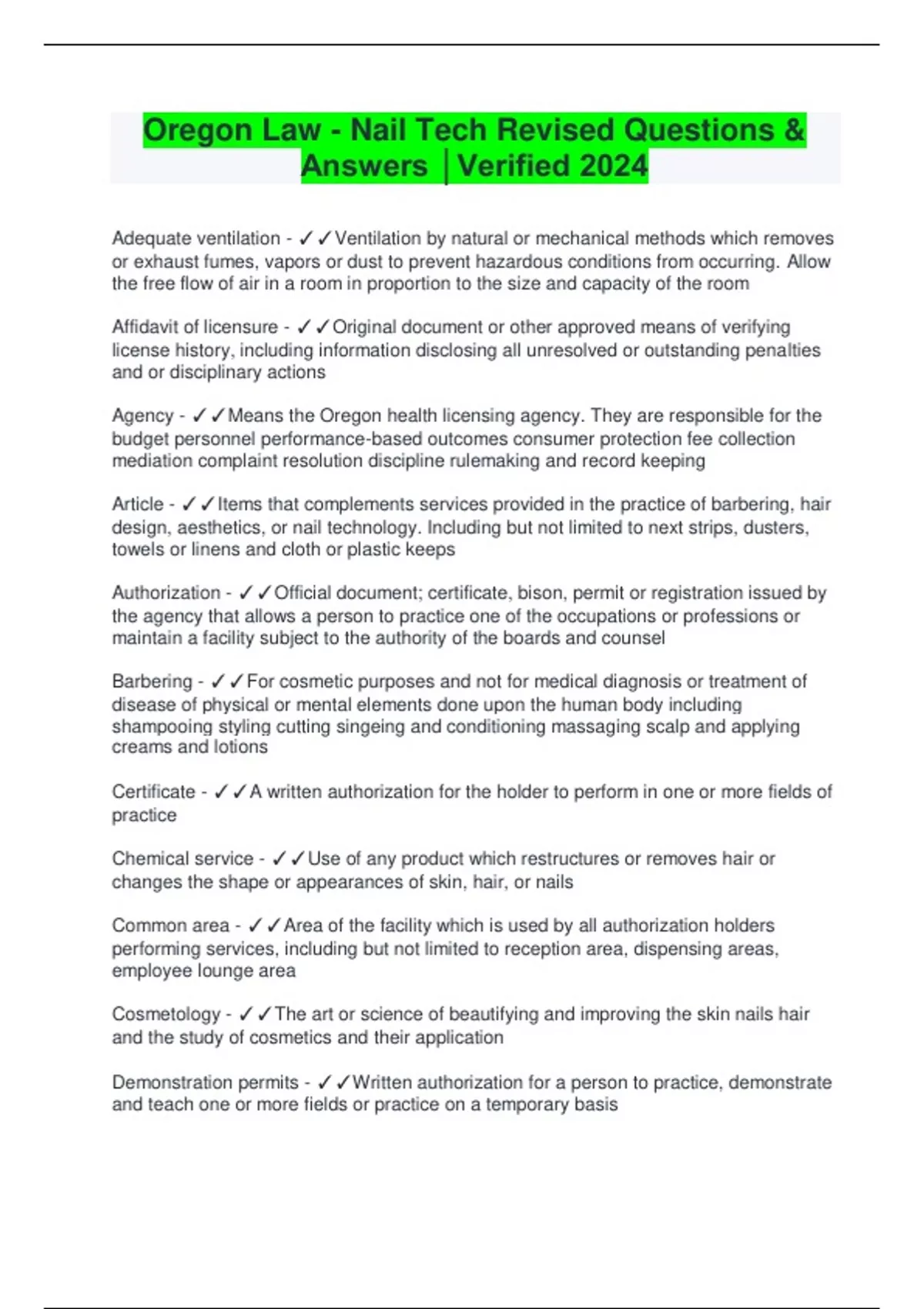 Oregon Law - Nail Tech Revised Questions & Answers │Verified 2024