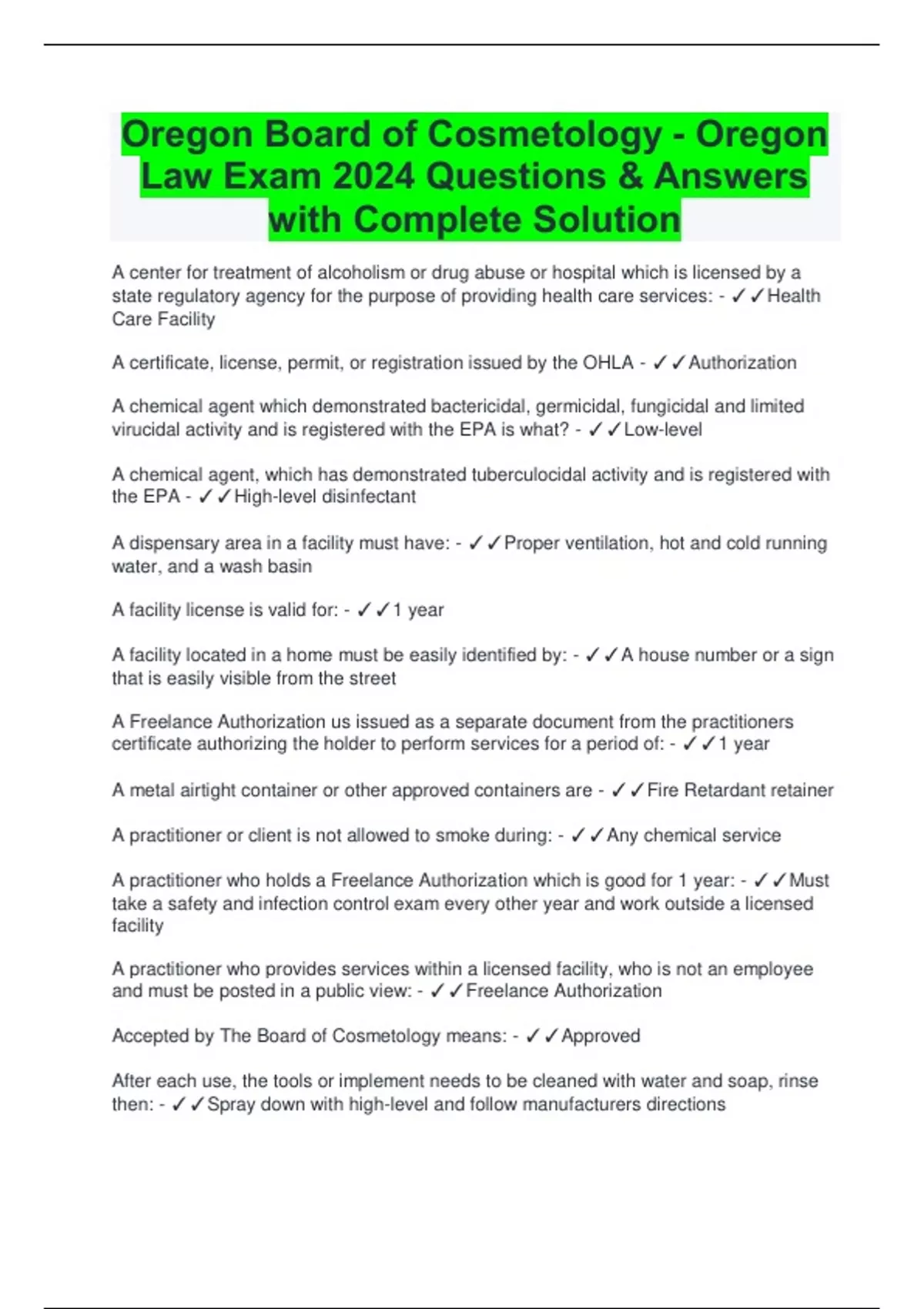 Oregon Board of Cosmetology - Oregon Law Exam 2024 Questions & Answers with Complete Solution A center for treatment of alcoholism or drug abuse or hospital which is licensed by a state regulatory agency for the purpose of providing health care services: - Health Care Facility A certificate, license, permit, or registration issued by the OHLA - Authorization A chemical agent which demonstrated bactericidal, germicidal, fungicidal and limited virucidal activity and is registered with the EPA is what? - Low-level A chemical agent, which has demonstrated tuberculocidal activity and is registered with the EPA - High-level disinfectant A dispensary area in a facility must have: - Proper ventilation, hot and cold running water, and a wash basin A facility license is valid for: - 1 year A facility located in a home must be easily identified by: - A house number or a sign that is easily visible from the street A Freelance Authorization us issued as a separate document from the practitioners certificate authorizing the holder to perform services for a period of: - 1 year A metal airtight container or other approved containers are - Fire Retardant retainer A practitioner or client is not allowed to smoke during: - Any chemical service A practitioner who holds a Freelance Authorization which is good for 1 year: - Must take a safety and infection control exam every other year and work outside a licensed facility A practitioner who provides services within a licensed facility, who is not an employee and must be posted in a public view: - Freelance Authorization Accepted by The Board of Cosmetology means: - Approved After each use, the tools or implement needs to be cleaned with water and soap, rinse then: - Spray down with high-level and follow manufacturers directions Agency - Oregon Health Licensing Agency Airtight metal container for disposing of chemical waste or storing linens with chemical residue - Fire retardant container All areas of foot spa equipment must be cleaned and disinfected with a: - High-level disinfectant All certificates, independent Contractors Registration, and licenses must be posted in: - Public view All chemical substances used in practice will be dispensed in a manner to: - Prevent contamination All disinfectant solutions and / or agents shall be kept at (blank) to maintain effectiveness, be free of foreign material and be available for immediate use at all times, when facility is open for business. - Adequate strengths All facility liquid waste shall be discharged directly into a public sewer or? - A septic tank and drain field requirements All items used in a field of practice which comes in contact with the client skin that cannot be cleaned or disinfected shall immediately discard into a: - Covered waste container All manual or mechanical devices and equipment used in a field of practice must meet all (blank) imposed by any federal, state, county, or local authority. - Product Registration requirements All materials that have not been approved by OHLA for disinfection and reuse shall be - Thrown away after use on client or given to the client All new, disinfected, or cleaned tools and implements shall be stored: - Separately from all other implements All outer surfaces of waste disposal containers must be kept: - Clean All tools and implements that come in direct contact with clients must be (blank) or (blank) - Disinfected / Disposed of All waste related to the performance of services shall be deposited in a covered waste container to avoid: - Potential cross contamination, Inhaling chemical fumes, Exposure to infectious waste material