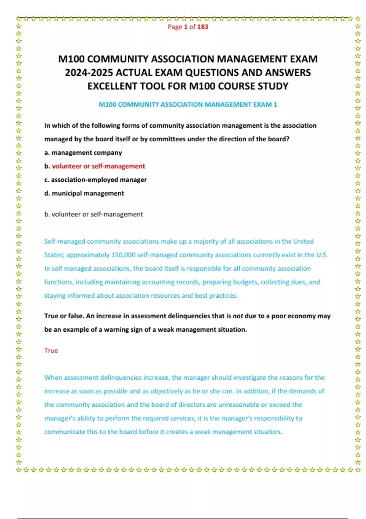 M100 COMMUNITY ASSOCIATION MANAGEMENT EXAM ACTUAL EXAM QUESTIONS AND ANSWERS EXCELLENT TOOL FOR M100 COURSE STUDY