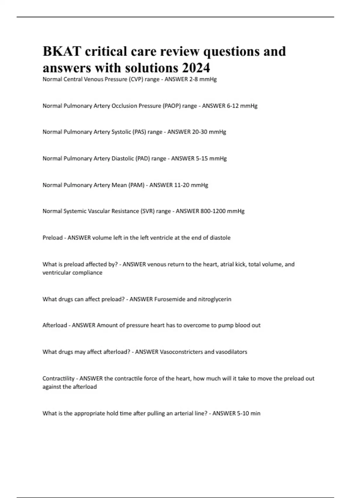 BKAT critical care review questions and answers with solutions 2024