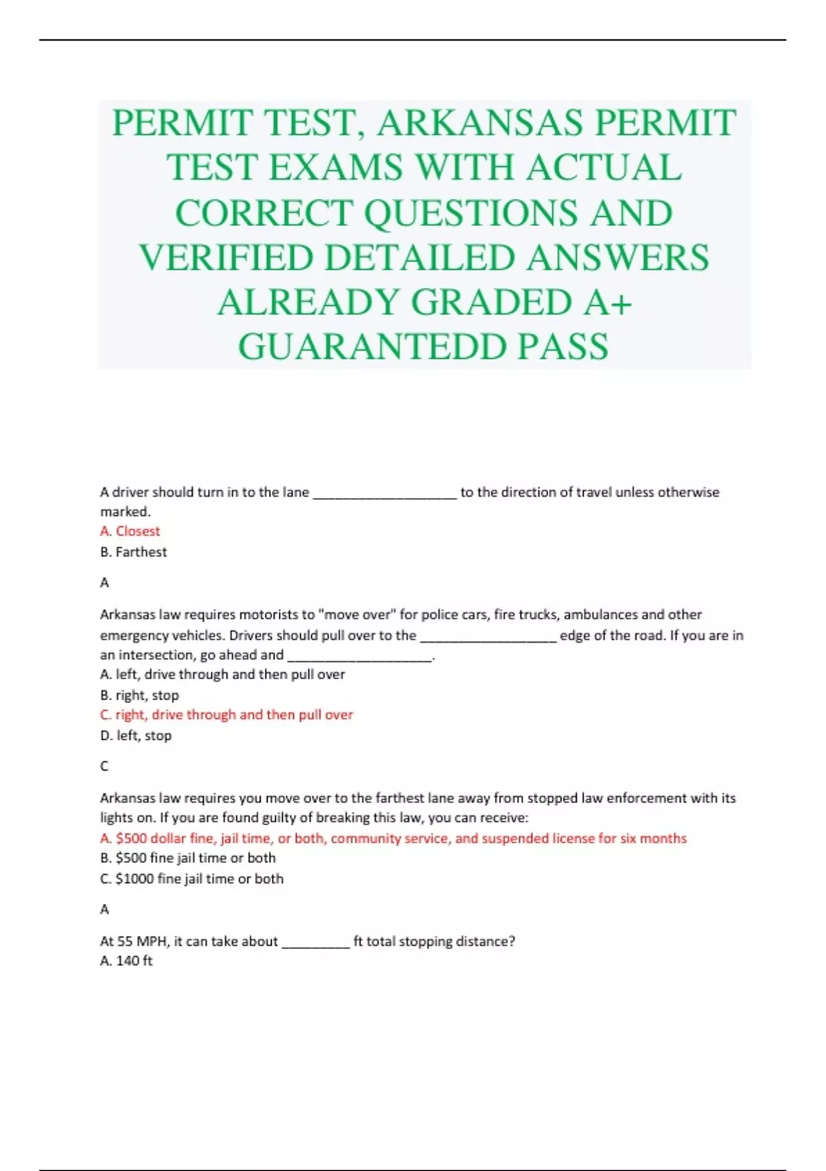PERMIT TEST, ARKANSAS PERMIT TEST EXAMS WITH ACTUAL CORRECT QUESTIONS AND VERIFIED DETAILED ANSWERS ALREADY GRADED A+ GUARANTEDD PASS