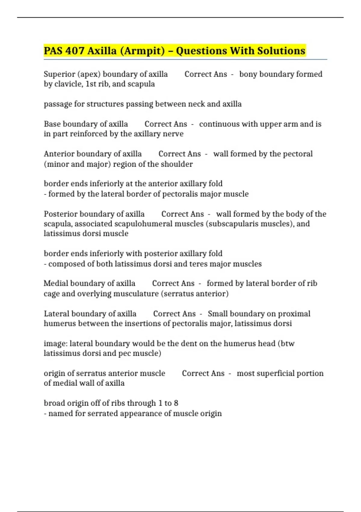 pas 407 axilla armpit questions with solutions