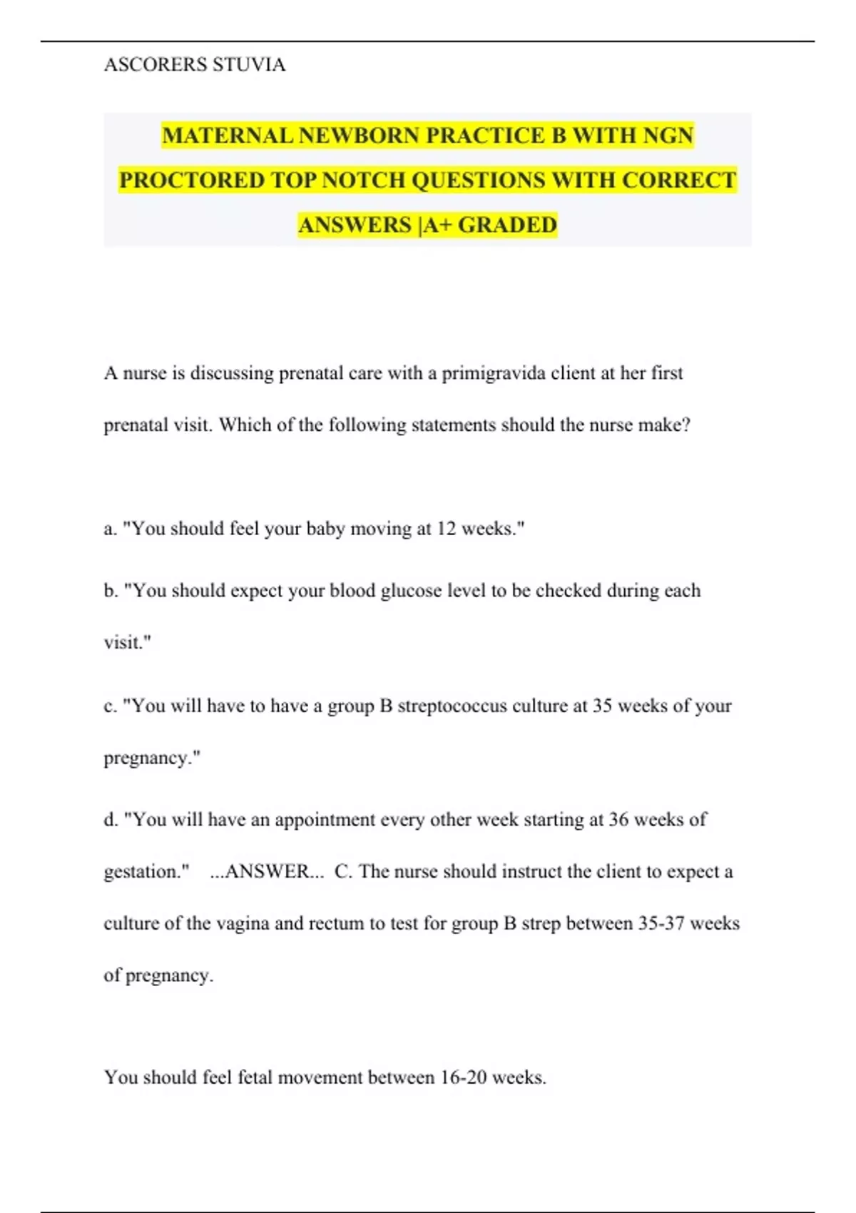MATERNAL NEWBORN PRACTICE B WITH NGN PROCTORED TOP NOTCH QUESTIONS WITH CORRECT ANSWERS |A+ GRADED MATERNAL NEWBORN PRACTICE B WITH NGN PROCTORED TOP NOTCH QUESTIONS WITH CORRECT ANSWERS |A+ GRADED