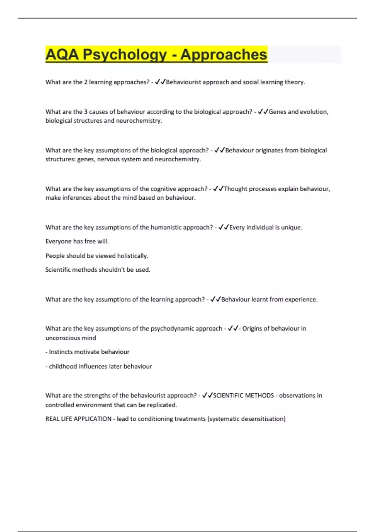 What are the 2 learning approaches? - Behaviourist approach and social learning theory. What are the 3 causes of behaviour according to the biological approach? - Genes and evolution, biological structures and neurochemistry. What are the key assumptions of the biological approach? - Behaviour originates from biological structures: genes, nervous system and neurochemistry. What are the key assumptions of the cognitive approach? - Thought processes explain behaviour, make inferences about the mind based on behaviour. What are the key assumptions of the humanistic approach? - Every individual is unique. Everyone has free will. People should be viewed holistically. Scientific methods shouldn't be used. What are the key assumptions of the learning approach? - Behaviour learnt from experience. What are the key assumptions of the psychodynamic approach - - Origins of behaviour in unconscious mind - Instincts motivate behaviour - childhood influences later behaviour What are the strengths of the behaviourist approach? - SCIENTIFIC METHODS - observations in controlled environment that can be replicated. REAL LIFE APPLICATION - lead to conditioning treatments (systematic desensitisation)What are the strengths of the biological approach? - REAL-LIFE APPLICATIONS - lead to effective treatments by altering neurotransmitter levels e.g. Serotonin and depressions SCIENTIFIC EVIDENCE - concordance rates for schizophrenia 48%MZ 17%DZ What are the strengths of the cognitive approach? - SCIENTIFIC METHODS - uses highly controlled experiments so confident, helps psychology and biology come together. APPLIED TO LIFE - used to treat depression (CBT) and development of artificial intelligence. What are the strengths of the humanistic approach? - Practical applications: developed counselling - meta-analysis of 86 studies. Less deterministic: allows personal development and considers free will. What are the strengths of the learning theory? - EVIDENCE - Bandura showed social learning in a controlled environment BUT not representative. FOCUSES ON COGNITIVE - emphasised meditational processes that suggest we have free will. What are the strengths of the psychodynamic approach? - Practical application: psychotherapy, bring memories into conscious. Case study: 'Little hans' phobia of horses because of big penis (phallic stage). What are the topics in the humanistic approach? - Rogers: focus on self and Maslow's hierarchy of needs. What are the topics in the psychodynamic approach? - Role of the unconscious, tripartite structure of personality, defence mechanisms and instincts and drives What are the weakness of the psychodynamic approach? - Case studies lack population validity. Can't be scientifically tested (personality). Too deterministic (prisoners of childhood)