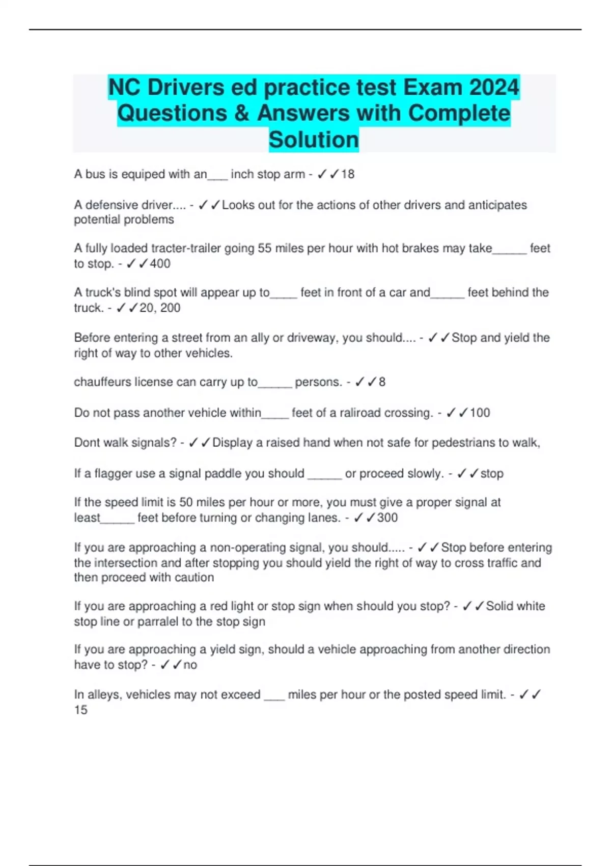 NC Drivers ed practice test Exam 2024 Questions & Answers with Complete Solution A bus is equiped with an___ inch stop arm - 18 A defensive driver.... - Looks out for the actions of other drivers and anticipates potential problems A fully loaded tracter-trailer going 55 miles per hour with hot brakes may take_____ feet to stop. - 400 A truck's blind spot will appear up to____ feet in front of a car and_____ feet behind the truck. - 20, 200 Before entering a street from an ally or driveway, you should.... - Stop and yield the right of way to other vehicles. chauffeurs license can carry up to_____ persons. - 8 Do not pass another vehicle within____ feet of a raliroad crossing. - 100 Dont walk signals? - Display a raised hand when not safe for pedestrians to walk, If a flagger use a signal paddle you should _____ or proceed slowly. - stop If the speed limit is 50 miles per hour or more, you must give a proper signal at least_____ feet before turning or changing lanes. - 300 If you are approaching a non-operating signal, you should..... - Stop before entering the intersection and after stopping you should yield the right of way to cross traffic and then proceed with caution If you are approaching a red light or stop sign when should you stop? - Solid white stop line or parralel to the stop sign If you are approaching a yield sign, should a vehicle approaching from another direction have to stop? - no In alleys, vehicles may not exceed ___ miles per hour or the posted speed limit. - 15