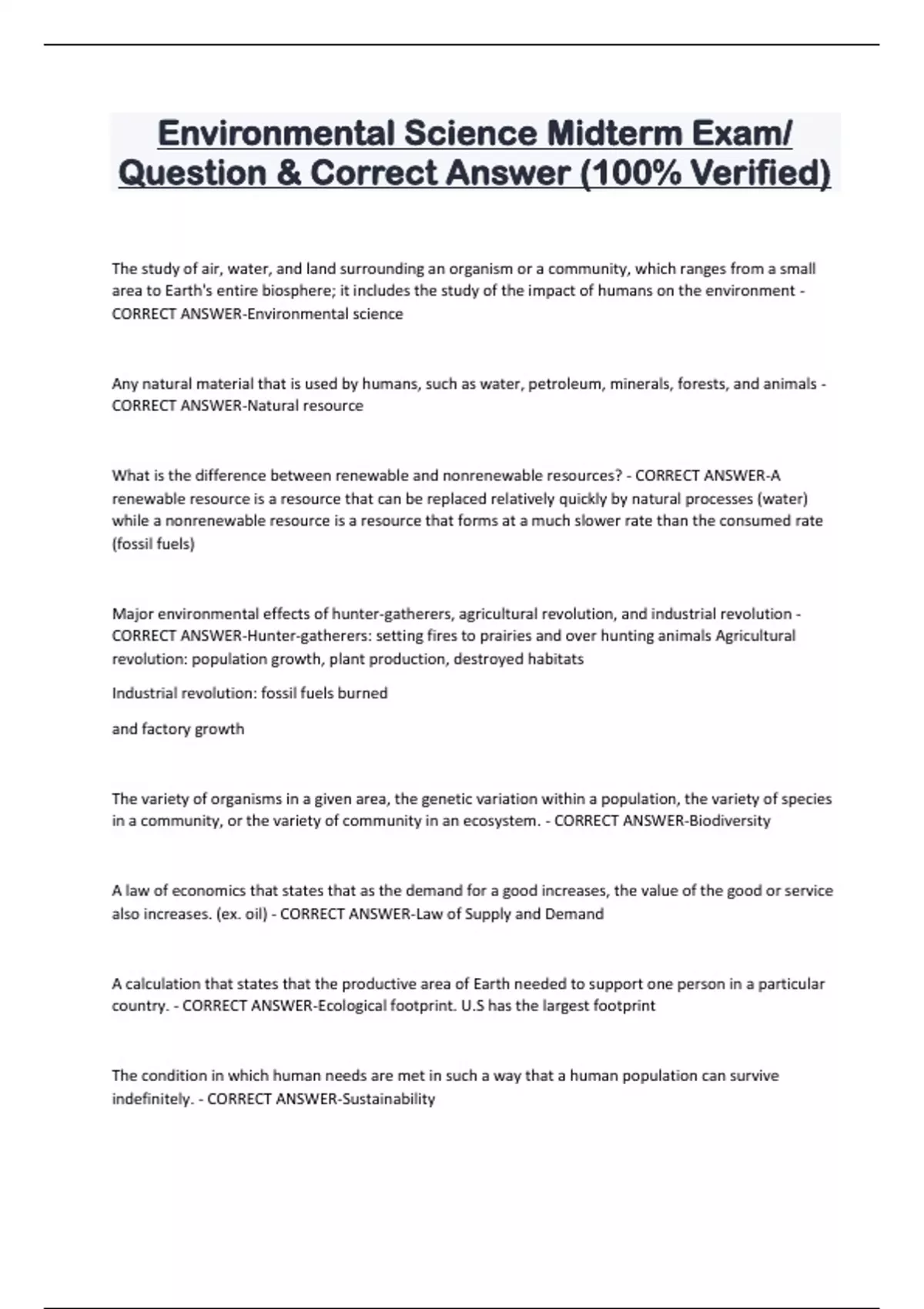 Environmental Science Midterm Exam/ Question & Correct Answer (100% Verified) The study of air, water, and land surrounding an organism or a community, which ranges from a small area to Earth's entire biosphere; it includes the study of the impact of humans on the environment - CORRECT ANSWER-Environmental science Any natural material that is used by humans, such as water, petroleum, minerals, forests, and animals - CORRECT ANSWER-Natural resource What is the difference between renewable and nonrenewable resources? - CORRECT ANSWER-A renewable resource is a resource that can be replaced relatively quickly by natural processes (water) while a nonrenewable resource is a resource that forms at a much slower rate than the consumed rate (fossil fuels