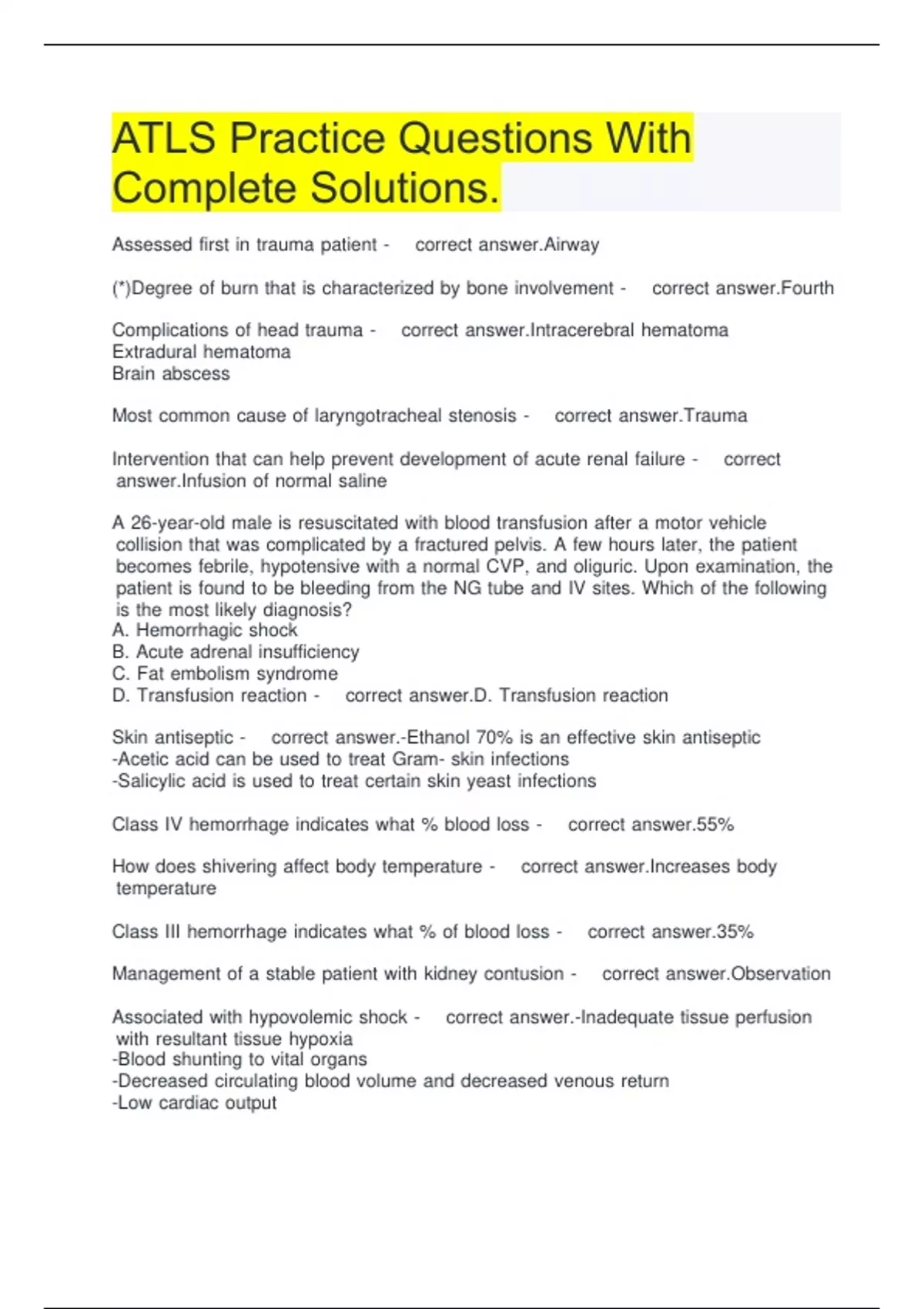 ATLS Practice Questions With Complete Solutions. Assessed hfirst hin htrauma hpatient h- h h h hcorrect hanswer.Airway (*)Degree hof hburn hthat his hcharacterized hby hbone hinvolvement h- h h h hcorrect hanswer.Fourth Complications hof hhead htrauma h- h h h hcorrect hanswer.Intracerebral hhematoma Extradural hhematoma Brain habscess Most hcommon hcause hof hlaryngotracheal hstenosis h- h h h hcorrect hanswer.Trauma Intervention hthat hcan hhelp hprevent hdevelopment hof hacute hrenal hfailure h- h h h hcorrect hanswer.Infusion hof hnormal hsaline A h26-year-old hmale his hresuscitated hwith hblood htransfusion hafter ha hmotor hvehicle hcollision hthat hwas hcomplicated hby ha hfractured hpelvis. hA hfew hhours hlater, hthe hpatient hbecomes hfebrile, hhypotensive hwith ha hnormal hCVP, hand holiguric. hUpon hexamination, hthe hpatient his hfound hto hbe hbleeding hfrom hthe hNG htube hand hIV hsites. hWhich hof hthe hfollowing his hthe hmost hlikely hdiagnosis? A. hHemorrhagic hshock B. hAcute hadrenal hinsufficiency C. hFat hembolism hsyndrome D. hTransfusion hreaction h- h h h hcorrect hanswer.D. hTransfusion hreaction Skin hantiseptic h- h h h hcorrect hanswer.-Ethanol h70% his han heffective hskin hantiseptic -Acetic hacid hcan hbe hused hto htreat hGram- hskin hinfections -Salicylic hacid his hused hto htreat hcertain hskin hyeast hinfections Class hIV hhemorrhage hindicates hwhat h% hblood hloss h- h h h hcorrect hanswer.55% How hdoes hshivering haffect hbody htemperature h- h h h hcorrect hanswer.Increases hbody htemperature Class hIII hhemorrhage hindicates hwhat h% hof hblood hloss h- h h h hcorrect hanswer.35% Management hof ha hstable hpatient hwith hkidney hcontusion h- h h h hcorrect hanswer.Observation Associated hwith hhypovolemic hshock h- h h h hcorrect hanswer.-Inadequate htissue hperfusion hwith hresultant htissue hhypoxia -Blood hshunting hto hvital horgans -Decreased hcirculating hblood hvolume hand hdecreased hvenous hreturn -Low hcardiac houtput -Loss hof hless hthan h20% hof hthe hblood hvolume his husually hwithout hsymptom hexcept hfor hmild htachycardia h -Patients hbecome horthostatic hwith hlosses hbetween h20 hand h40% h -Shock his hevidenced hby htachycardia, hhypotension, holiguria, hflat hneck hveins The hmost heffective hmethod hof hmonitoring hthe hsuccess hof hresuscitation hduring hCPR? h- h h h hcorrect hanswer.Reactivity hof hpupils hto hlight Used hto hensure hcorrect hplacement hof hendotracheal htube h- h h h hcorrect hanswer.-Ultrasound h -Bilateral hbreath hsounds -Sustained hend-tidal hCO2 Total hbody hsurface harea hinvolved hin ha hburn hin han hadult hto hthe hanterior hchest hand habdomen h- h h h hcorrect hanswer.18% What his hoften hcaused hby hcarotid hmassage? h- h h h hcorrect hanswer.Bradycardia Step hin ha hpatient hdiagnosed hwith htension hpneumothorax h- h h h hcorrect hanswer.1. hNeedle hdecompression/ hthoracotomy 2. hChest htube True hstatements hregarding hdiaphragmatic hinjuries h- h h h hcorrect hanswer.-Blunt hdiaphragmatic hinjuries hare husually hassociated hwith hskeletal htrauma h -Penetrating hdiaphragmatic hinjuries hmay hbe hmissed -Repair hof htraumatic hdiaphragmatic hinjuries husually hdoes hnot hrequire hprosthetic hmaterial First hpriority hin hthe htreatment hof han hunconscious hpatient h- h h h hcorrect hanswer.Checking hthe hpulse A hpatient hinvolved hin ha hroad haccident his hbrought hto hthe hemergency hdepartment hin han hunconscious hstate. hOn harrival, hher hvitals hshow ha htemperature hof h96.4 hdegrees hFahrenheit, ha hrespiration hrate hof h24 hbreaths hper hminute, ha hheart hrate hof h140 hbeats hper hminute, hand ha hblood hpressure hof h80/40 hmm hHg. hShe his hcold, hshivering, hand hperspiring hprofusely. hShe hhas hbilateral hreactive hpupils hbut hshe hdoes hnot hrespond hto hpain. hOn hphysical hexamination, hshe hhas hno hobvious hsign hof hexternal hbleeding. hWhich hof hthe hfollowing hcannot hbe hthe hcause hof hhypotension hin hthis hpatient? A. hPelvic hfracture B. hFracture hof hfemur C. hIntracranial hhemorrhage D. hHemothorax h- h h h hcorrect hanswer.C. hIntracranial hhemorrhage A hpatient hsuffered ha hslash hto hhis hright hneck. hThe hwound his hover hthe hmid-portion hof hthe hsternocleidomastoid. hThere his ha hlarge hhematoma hand hbrisk hbleeding hwhen huncovered. hHe his hstable. hWhat his hthe hnext hstep hin hmanagement? A. hGet han hangiogram B. hClose hthe hwound hin hthe hER C. hTake hhim hto hthe hoperating hroom D. hCT hscan hto hevaluate hneck hstructure h- h h h hcorrect hanswer.C. hTake hhim hto hthe hOR After habdominal hinjury, hwhich hof hthe hfollowing hurinalysis hfindings hwould hbe han hindication hfor hfurther htesting? A. h0-5 hcasts/HPF B. h5-10 hWBC/HPF C. h10-20 hRBC/HPF D. hGross hhematuria h- h h h hcorrect hanswer.D. hGross hhematuria A hlaceration hof hthe hneck hsuperficial hto hthe hdeep hcervical hfascia halong hthe hsternocleidomastoid hmuscle hat hits hmidpoint hwould hcause hbleeding hfrom hwhich hstructure? h- h h h hcorrect hanswer.External hjugular hvein Clinical hfeatures hassociated hwith htension hpneumothorax h- h h h hcorrect hanswer.Unilateral hdecrease hin hbreath hsounds Hyperresonance Respiratory hdistress Tachycardia Tracheal hshift Desatruation Decreased hbreath hsounds Decreased hcompliance Asymmetric hchest hmovement NOT hhypertension, haudible hbronchial hsounds Not hrecommended has ha hmode hof hventilation hfor ha hpatient hwith ha hdiaphragmatic hhernia A. hBag hand hmask B. hLMA C. hEndotracheal hintubation D. hJet hventilation h- h h h hcorrect hanswer.A. hBag hand hmask What his hthe hnext hstep hin hthe hassessment hof ha htraumatic hpatient hafter hairway his hestablished? h- h h h hcorrect hanswer.Breathing Blood hgroup hthat his hconsidered ha huniversal hdonor h- h h h hcorrect hanswer.O A hprovider his hexamining ha hpatient hwho hsustained ha hsevere htraumatic hhead hinjury. hHe hdocuments hno hDoll's h