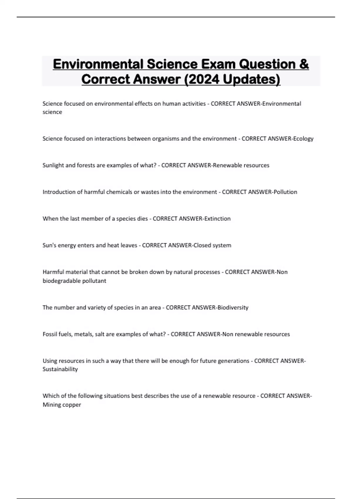 Environmental Science Exam Question & Correct Answer (2024 Updates) Science focused on environmental effects on human activities - CORRECT ANSWER-Environmental science Science focused on interactions between organisms and the environment - CORRECT ANSWER-Ecology Sunlight and forests are examples of what? - CORRECT ANSWER-Renewable resource