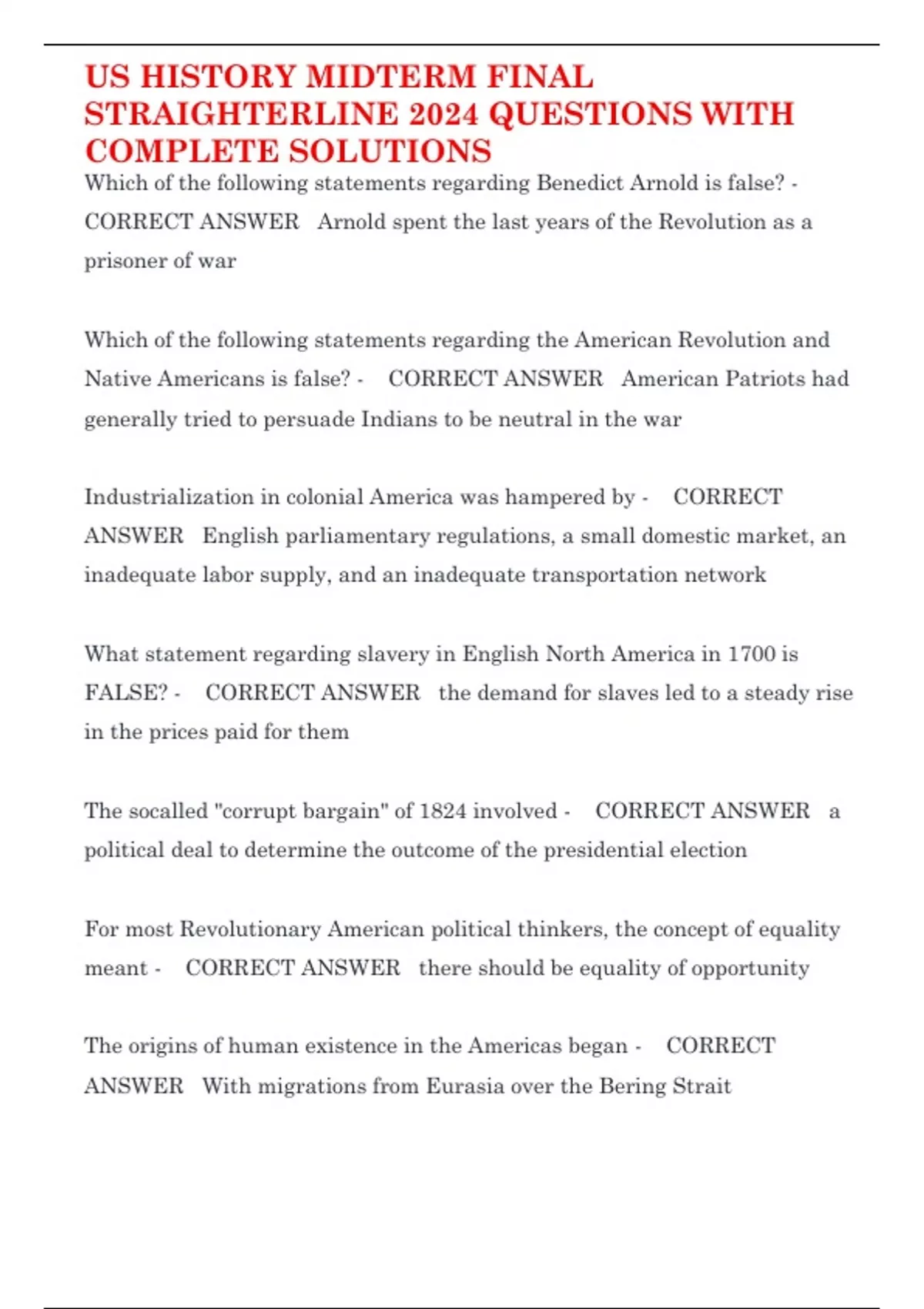 Which of the following statements regarding Benedict Arnold is false? - CORRECT ANSWER Arnold spent the last years of the Revolution as a prisoner of war Which of the following statements regarding the American Revolution and Native Americans is false? - CORRECT ANSWER American Patriots had generally tried to persuade Indians to be neutral in the war Industrialization in colonial America was hampered by - CORRECT ANSWER English parliamentary regulations, a small domestic market, an inadequate labor supply, and an inadequate transportation network What statement regarding slavery in English North America in 1700 is FALSE? - CORRECT ANSWER the demand for slaves led to a steady rise in the prices paid for them The socalled "corrupt bargain" of 1824 involved - CORRECT ANSWER a political deal to determine the outcome of the presidential election For most Revolutionary American political thinkers, the concept of equality meant - CORRECT ANSWER there should be equality of opportunity The origins of human existence in the Americas began - CORRECT ANSWER With migrations from Eurasia over the Bering Strait Colonial protests against the townshed duties resulted in - CORRECT ANSWER Many colonists joining in non-importation agreements In the early nineteenth century, the explorer, Stephen Long - CORRECT ANSWER agreed with the findings and conclusions of Zebulon Pike Many colonists believed the legislation passed by the Grenville ministry in - CORRECT ANSWER meant the British were trying to take away their tradition of self-government What factor is believed to have dramatically reduced New World native populations after contact with Europeans? - CORRECT ANSWER disease Delegates to the Constitutional Convention of 1787 recommended the document be ratified by - CORRECT ANSWER special state ratifying conventions Prior to becoming president, James Monroe had - CORRECT ANSWER served as secretary of state In the eighteenth century, under the English government's theory of representation - CORRECT ANSWER the American colonies were represented in Parliament