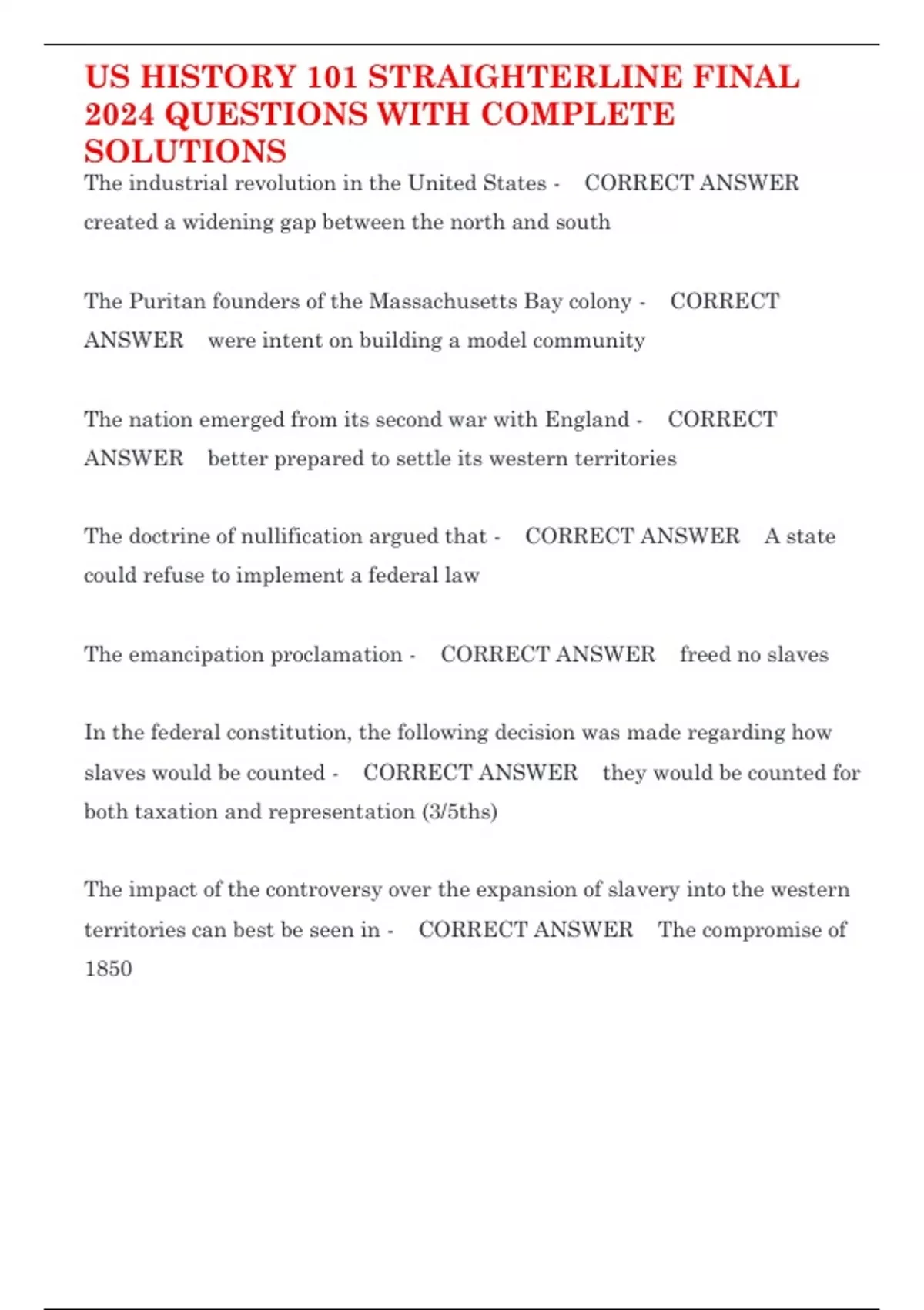 The industrial revolution in the United States - CORRECT ANSWER created a widening gap between the north and south The Puritan founders of the Massachusetts Bay colony - CORRECT ANSWER were intent on building a model community The nation emerged from its second war with England - CORRECT ANSWER better prepared to settle its western territories The doctrine of nullification argued that - CORRECT ANSWER A state could refuse to implement a federal law The emancipation proclamation - CORRECT ANSWER freed no slaves In the federal constitution, the following decision was made regarding how slaves would be counted - CORRECT ANSWER they would be counted for both taxation and representation (3/5ths) The impact of the controversy over the expansion of slavery into the western territories can best be seen in - CORRECT ANSWER The compromise of 1850