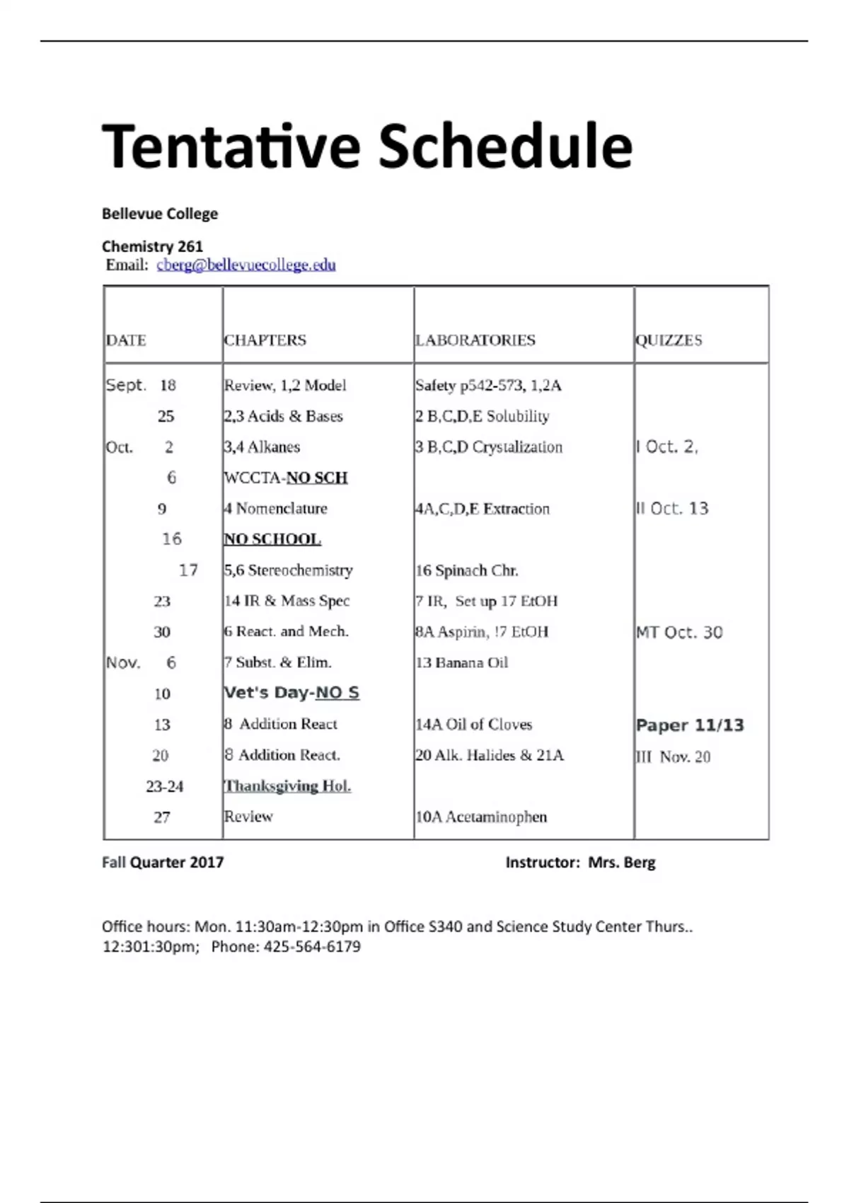Chemistry 261 Fall Quarter 2017 Instructor: Mrs. Berg Office hours: Mon. 11:30am-12:30pm in Office S340 and Science Study Center Thurs.. 12:301:30pm; Phone: Text, laboratory book, laboratory goggles and lab write-up manual, periodic chart, homework, projects and quizzes are required!!! Optional: Molecular Model Kit and Colored pencils for taking notes Late work is not accepted unless ill and the instructor is notified immediately!!! Please register with the Disability Resource Center in B 132 (phone: ) if you have an accommodation falling under the Americans with Disabilities Act and see me privately. The last day to withdraw without a “W” posted is Sept. 29 and with a “W” is Nov. 3. This must be documented with registration. If the class is not completed, the grade is the sum of the scores obtained before leaving. No cellular phones are to be active and ringing in class and should be left in your backpack!!!!!! Extra help is available in the Science Study Center S 114 every day and with me during office hours!!!!!! Grading Scale: 95% = A Homework (5) = 25 points 90% = A- Review Paper (1) = 25 points 85% = B+ Lecture Quizzes (2) = 100 points 80% = B Lecture Mid-term (1) = 100 points 78% = BLabs (10) = 100 points 75% = C+ Lab quizzes (10) = 50 points 70% = C Molecules (4) = 4 points 68% = C Final Exam (1) = 100 points 65% = D+ Total = 504 points 60% = D Less = F Bellevue College Laboratory Notebook Reports The report for each experiment is written neatly in ink using a book store lab manual as follows: (Note: Save the first 2 pages as the Table of Contents) Before Lab: 1. Title of the experiment, date and name of partner 2. Purpose: Describe the skills to be learned and the principles to be demonstrated by proper performance of the experiment 3. Formulas and reactions if mentioned in the lab book 4. Procedure: List and number the steps necessary to perform the lab without using your lab book because your hardback lab book is not allowed in the lab (note: leave enough space for observations). New setup pictures may be copied from the back of the book 5. Pre-lab Exercises: Answer any pre-lab questions if noted in your lab book. Most labs will not have pre-lab work. 6. Data: Prepare a section to record the data as suggested in your lab book or as needed for each lab During and After Lab: 1. Data: Complete the Data section during lab and add notes to the procedure section describing color changes or other sensory observations 2. Tabulated Results: This section might include a table or analyzed scan to properly explain your data section, but is only necessary on specific labs 3. Questions: Answer any questions found in the lab book that pertain to this particular lab (Note: at the back of the lab section) 4. Discussion: Two sections written in complete sentences are required for the discussion section a. Problems and errors: Include all possible errors that caused your data to be imperfect or difficult b. Learning: Describe what was learned by this laboratory and remember that this section should agree with your purpose. Include learning from the lecture and book material which enhanced your understanding of the laboratory material. Bellevue College Chemistry 261 Fall 2017 Review Paper