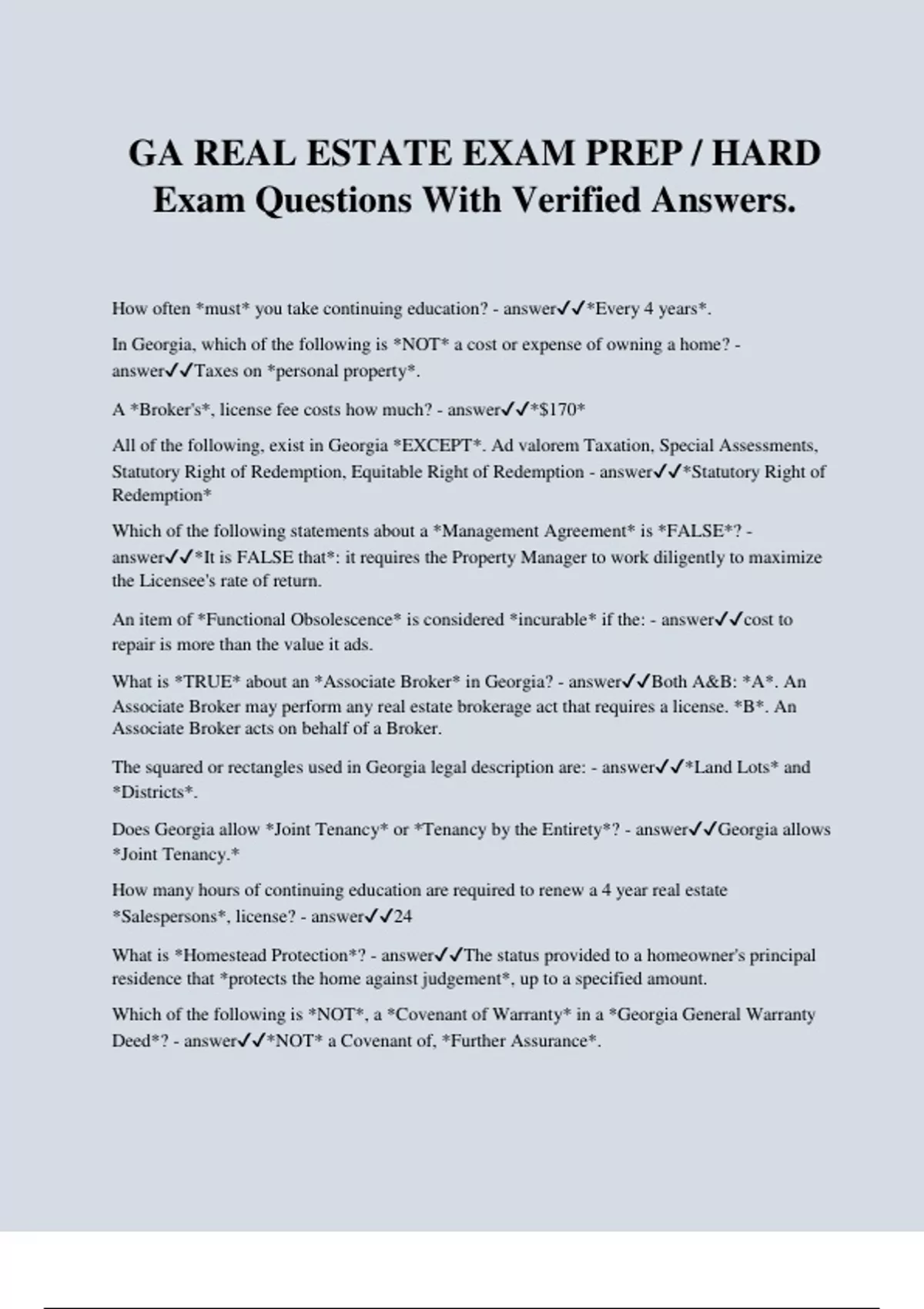 GA REAL ESTATE EXAM PREP / HARD Exam Questions With Verified Answers. How often *must* you take continuing education? - answer*Every 4 years*. In Georgia, which of the following is *NOT* a cost or expense of owning a home? - answerTaxes on *personal property*. A *Broker's*, license fee costs how much? - answer*$170* All of the following, exist in Georgia *EXCEPT*. Ad valorem Taxation, Special Assessments, Statutory Right of Redemption, Equitable Right of Redemption - answer*Statutory Right of Redemption* Which of the following statements about a *Management Agreement* is *FALSE*? - answer*It is FALSE that*: it requires the Property Manager to work diligently to maximize the Licensee's rate of return. An item of *Functional Obsolescence* is considered *incurable* if the: - answercost to repair is more than the value it ads. What is *TRUE* about an *Associate Broker* in Georgia? - answerBoth A&B: *A*. An Associate Broker may perform any real estate brokerage act that requires a license. *B*. An Associate Broker acts on behalf of a Broker. The squared or rectangles used in Georgia legal description are: - answer*Land Lots* and *Districts*. Does Georgia allow *Joint Tenancy* or *Tenancy by the Entirety*? - answerGeorgia allows *Joint Tenancy.* How many hours of continuing education are required to renew a 4 year real estate *Salespersons*, license? - answer24 What is *Homestead Protection*? - answerThe status provided to a homeowner's principal residence that *protects the home against judgement*, up to a specified amount. Which of the following is *NOT*, a *Covenant of Warranty* in a *Georgia General Warranty Deed*? - answer*NOT* a Covenant of, *Further Assurance*. To keep a Georgia Sales Associate License, an individual must do all of the following *EXCEPT*: - answer*EXCEPT* Take at least ten quarter hours or six semester hours of college courses in real estate. Based on the ability to accept assignments, *which appraiser has the most latitude*? - answer*Certified General* The real estate records in Georgia are maintained by the: - answer*Clerk of Superior Court* To be recorded in Georgia, the deed must be witnessed by: - answerone official witness and one unofficial witness. A buyer signs a contract to purchase a commercial building in Savannah. The contract is silent as to who bears the risk of loss proper to closing. *After the contract is signed, but before the closing*, the building burns to the ground.According to Georgia law the. - answer*BUYER* must bear the risk of loss or damage before the closing. In Georgia, the Landlord's eviction of a tenant is generally known as: - answera *DISPOSSESSION*. Real property legal descriptions in Georgia can be based on all of the following *EXCEPT*: Land Lots, Township, Georgia Militia Districts, Districts. - answer*EXCEPT, Township*. Under Georgia law, to claim adverse possession, the claim *Must* be: - answer*Must be,* Accompanied by a *Claim of Right* and *Free of Fraud.* The relationship between *Broker and Seller* is generally what type of agency? - answer*Special*. Which *State Agency* is responsible for the implementation of the *Georgia Lead Paint Prevention Act* of 1994? - answer*Georgia Department of Natural resources*. In Georgia, the legal document that pledges the property as collateral for repayment of the loan is the: - answer*Security Deed*. A community that merges, housing, recreation and commercial units into one self contained development is called a : - answer*pud*. The period of time in Georgia in which *Adverse Possession* ripens is: - answer*Seven (7) years under Color of Title.* Is Georgia a *Community Property State?* - answer*No* Does Georgia have *Dower Laws?* - answer*No* In Georgia, *Broker Duties* owed to a client: - answerAre determined by *BRRETA* or *Brokerage Relationships in Real Estate Transaction's act*
