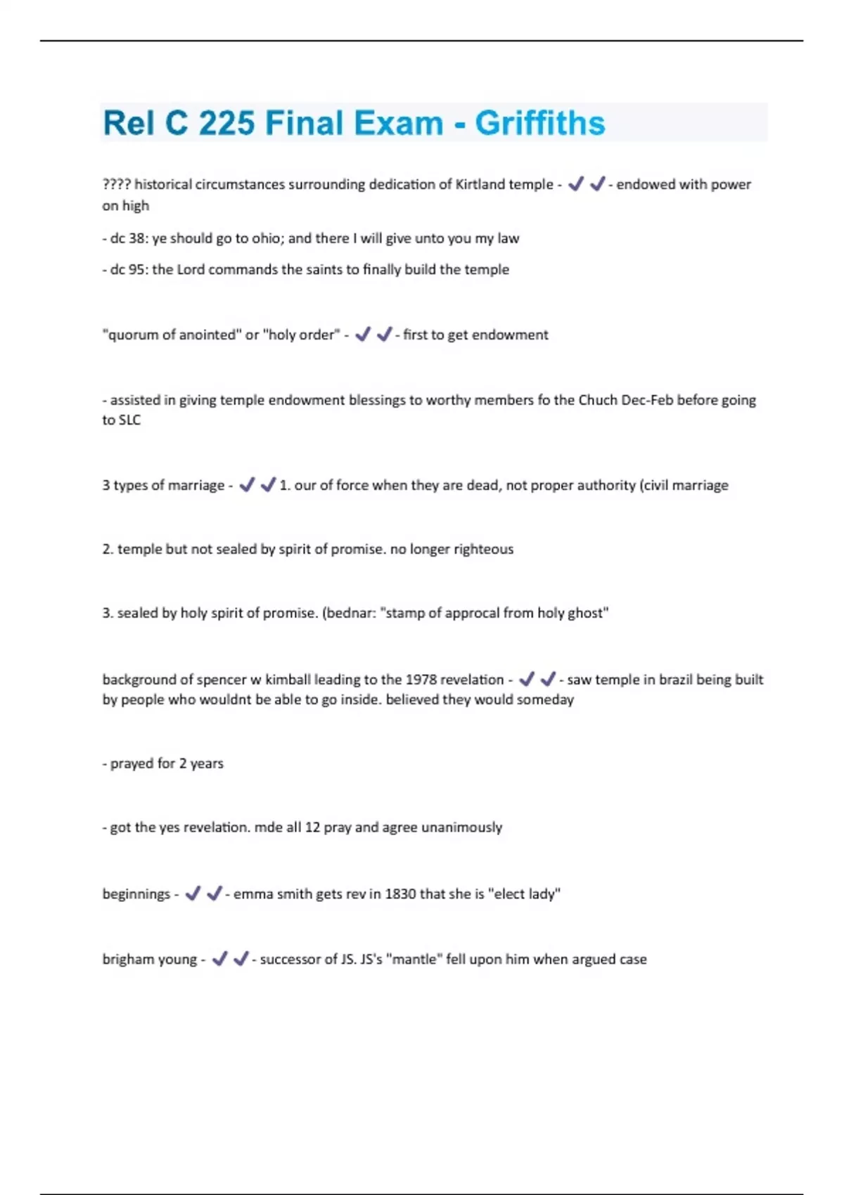 ???? historical circumstances surrounding dedication of Kirtland temple - - endowed with power on high - dc 38: ye should go to ohio; and there I will give unto you my law - dc 95: the Lord commands the saints to finally build the temple "quorum of anointed" or "holy order" - - first to get endowment - assisted in giving temple endowment blessings to worthy members fo the Chuch Dec-Feb before going to SLC 3 types of marriage - 1. our of force when they are dead, not proper authority (civil marriage 2. temple but not sealed by spirit of promise. no longer righteous 3. sealed by holy spirit of promise. (bednar: "stamp of approcal from holy ghost" background of spencer w kimball leading to the 1978 revelation - - saw temple in brazil being built by people who wouldnt be able to go inside. believed they would someday - prayed for 2 years - got the yes revelation. mde all 12 pray and agree unanimously beginnings - - emma smith gets rev in 1830 that she is "elect lady" brigham young - - successor of JS. JS's "mantle" fell upon him when argued case- he and council of 50 lead saints west "this is the place" -told saints in cedar to let emigrants go in peace...mountain meadow massacre - pres of 12 - received rev that is section 138 - announced black could not do priesthood/ordinances brigham young - makes wow announcement more efforts to live law of consecration mostly in church in west priesthood policy with black africans restarts relief society in west c: edward partridge - first bishop (portions law of consecration). had to distribute off of wants/needs convert from mission to lamanites was tarred and feathered at printing press. mob felt bad bc he was too humble c: hyrum smith - josephs brohterone of eight witnesses second patriarch of church martyred with JS assistant prez after oliver c: Joseph smith jr - first prophet of resortaion liked to wrestle and ponder c: sidney rigdon - convert from the mission to lamanites saw "the vision" minister in kirtland ohio main helper/scribe in JST translation circumstances and causes of the 1838 mormon war in missouri - causes: the growing mormon population in Missouri was seen as an economic and political threat to their nonmormon neighbors extermination order against all mormons - governor boggs "to any extent you may think necessary" - Infringement on freedom of religionhaun's mill massacre - men and boys, almost no survivors circumstances around mountain meadows massacre - Eyring: mountain meadows massacre inexusable 1. haight wants to attack emmigrants 2. Lee & Indians attack the emigrant wagon. 2 cedar city men attack emigrants by wagon corral.One survives and brings news that local settlers are attacking emigrants 3. Haight goes to Parowan to meet with Dane. deiced that emigrant company should be allowed on their way 4. Haight goes back to cedar and sends order to kill all emigrants except for children 5. militia and indans kill emigrants (except for 17 small kids). blamed indians at first but got found out 6. message finally returned from slc. BY said to let them go in peace. *John D Lee main perpetrator in pushin issue. executed for actions. circumstances around Utah War - - Americas first civil war to some historians - prez buchanan ordered a force of 2500 to escort Cumming new governor, to Utah - aligned nauvoo legion, against 1/3 US army - peaceful settlement is reached through negotiations by Thomas Kane, non-mormon friend of the saintscomprehending god - if men do not comprehend the character of god they do not comprehend themselves context and teachings in dc 132 (sealing power, types of marriages, importance..) - dc 132 written to persuade emma on plural marriage (urged by hyrum smith) but she got angry. context of king follet discourse - given because a church elder named King Follet had died in an accident a few weeks prior, JS asked to speak at funeral correct and false ideas taught in Church about the nature of priesthood policy - circumstances not race determine ability to hold blacks not black bc choices in heaven policy is temporary doctrine is eternal common erroneous beliefs: - people with dark skin could not hold - africans descendents of Cain - came to earth through this lineage less noble - Counsel and early practices concerning baptisms for the dead - at first, baptisms that were not witnessed or recorded correctly had to be redone (rudger clawson) - gender disregard - received knowledge in this way: here a little, there a little. welding link - between fathers and childrengreatest responsibility david o mckay - -softened stance on blacks priesthood, fijian and others of non-african descent could get it - concerned the practice "policy" not "doctrine" - 1954 made committee to see if policy was justified - recieved no revelation but considered changing policy dc 124 - reconstruction of the church dc 132 - celestial marriage and plural marriage dc 135 - announcement of martyrdom. "their innocent blood testifies of the truth and divinity of the work" dc 136 - the word and will of the lord (brigham at winter quaters) dc 136 - the word and will of the lord given at winter quarters by BY "prophets are slain so that they might be honored and the wicked condemned" dc 136: instructions given to saints during their trek west - let each company bear an equal portionhelping each other (widows, poor, fatherless0 prepare houses and fields use all will and influence to make stake of zion dc 138 - vision of the spirit world (joseph f smith) different approaches toward the second coming - premillenialism -world will get worse until christ comes and intiates era of peace amillennialism - millennialism and saviors return are figuritive - era of peace happens inwardly postmillenialism - mankind will imporve until good enough for christ to come
