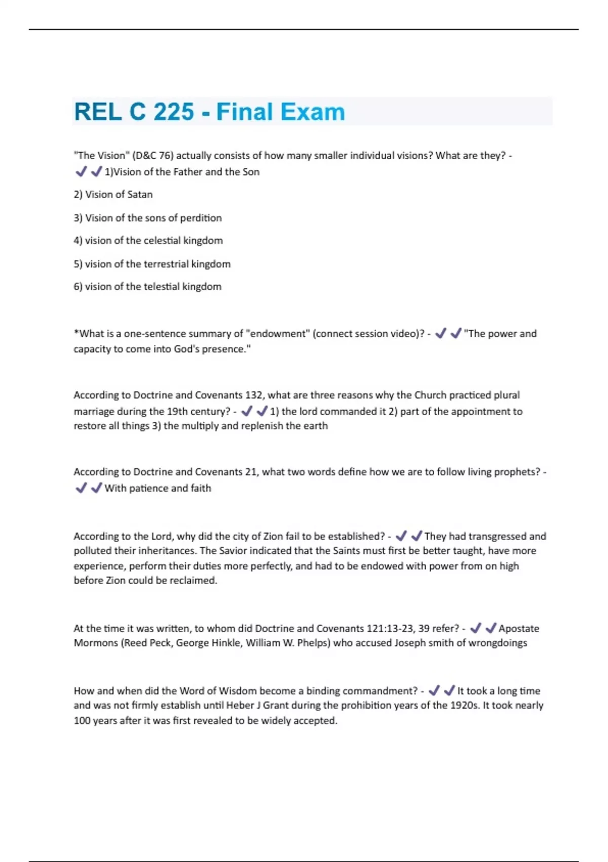 "The Vision" (D&C 76) actually consists of how many smaller individual visions? What are they? - 1)Vision of the Father and the Son 2) Vision of Satan 3) Vision of the sons of perdition 4) vision of the celestial kingdom 5) vision of the terrestrial kingdom 6) vision of the telestial kingdom *What is a one-sentence summary of "endowment" (connect session video)? - "The power and capacity to come into God's presence." According to Doctrine and Covenants 132, what are three reasons why the Church practiced plural marriage during the 19th century? - 1) the lord commanded it 2) part of the appointment to restore all things 3) the multiply and replenish the earth According to Doctrine and Covenants 21, what two words define how we are to follow living prophets? - With patience and faith According to the Lord, why did the city of Zion fail to be established? - They had transgressed and polluted their inheritances. The Savior indicated that the Saints must first be better taught, have more experience, perform their duties more perfectly, and had to be endowed with power from on high before Zion could be reclaimed. At the time it was written, to whom did Doctrine and Covenants 121:13-23, 39 refer? - Apostate Mormons (Reed Peck, George Hinkle, William W. Phelps) who accused Joseph smith of wrongdoings How and when did the Word of Wisdom become a binding commandment? - It took a long time and was not firmly establish until Heber J Grant during the prohibition years of the 1920s. It took nearly 100 years after it was first revealed to be widely accepted.How and where was the temple endowment introduced in Nauvoo? - May 4, 1842. The upper room of the red brick store. Washings, anointing, endowments were presented. How can we each also receive a fulness? - Through obedience to the commandments How can we participate in the ongoing restoration? - 1) Actively participate in the work of salvation (help members live the gospel, missionary work, care for the poor and need, and enabling the salvation of the dead). 2) receive and pass on the covenants of the gospel to your descendants 1. Be thou humble 2. Learn, Re-learn, and unlearn 3. Be a good source scholar 4. Lead with the 3 sisters (faith, hope, and charity), avoid terrible triplets (fear, doubt, and pride) 5. Worship Christ's Will, Not Cultural Values. 6. Live the Law of Consecration 7. Stay in the boat and row on! 8. Follow the United, Current Prophets 9. Stand by Joseph 10. Be loyal to your covenants with Christ How did we get The Pearl of Great Price, and when was it canonized? - Apostle Franklin D. Richards compiled the Pearl of Great Price while serving as president of the British Mission. The book was widely used as the Church grew, and on 10 Oct 1880 Church leaders voted it into the canonized standard works. How is doctrine established for the Church? - Modern prophets, seers, and revelators seek the Lord's will to receive revelation and direction to UNANIMOUSLY establish doctrine. How many years passed from Moroni's first visit to Joseph Smith until Joseph could obtain the gold plates? - 4 years ()How was the Book of Mormon translated? - By the gift and power of god How, when, and where was the Church organized? - Tuesday, April 6, 1830, at the home of Peter Whitmer Sr. in Fayette, New York How, why, and when was Official Declaration 1 released? - There were growing tensions with the government and the church did not want all of its assets (especially the temples) to be taken away. President Wilford Woodruff issued it on October 6, 1890. This led to the end of the practice of plural marriage in the Church. In conjunction with sealings, what is the law of adoption and how and when did it end? - People being sealed to the apostles/prophets. It ended in April of 1894 On what legal charges was Joseph Smith incarcerated in Carthage Jail? - Treason (charges for destroying the Nauvoo Expositor) Second only to Brigham Young, who was the person largely in charge of making temple worship central to the Saints? - Wilford Woodruff What are 3 types of marriage described in D&C 132 and their heavenly results? - 1- Non-eternal marriage: not sealed for eternity through the priesthood. Remain without exaltation. 2- Unfaithful eternal marriage: those who do not keep their marriage covenants or are "sealed" without proper authority. Cannot inherit his glory 3- Faithful, eternal marriage: faithful and eternally bound marriage. Exaltation and glory. They shall be gods. What are five factors for evaluating a historical source? - -Is it a primary source? You were there. You experienced it. - Is it a contemporary account?Produced at or near to the time of the event. Earlier it is recorded, the more accurate. - Does it have an objective perspective? Look for judgmental words. "there is no such thing as objective history"- What is its relationship to other sources? Looking for a consistent story across accounts - Are its claims supported by evidence? What are four levels of evaluating an official Church teaching? - - Harmonized Scriptures (Is it repeatedly found in the scriptures and in the 4 standard works?) - The united voice of the current Brethren (Is it proclaimed by the united voice of the current Brethren?) - Repeated teachings from the current general authorities and officers (Is it consistently taught by current General Authorities and general officers acting in their official capacity?) - Current/recent publications of the Church (Is it found in recent Church publications or statements?) What are several key principles to remember when considering Doctrine and Covenants revelations— including why written revelations have sometimes been altered? - - Revelations are written in a prophet's language, Prophets can refine revelation text, Not all prophetic revelations are canonized, The First Presidency and Quorum of the Twelve Apostles canonize scripture. - Joseph does alter doctrine and covenants revelations for typos or errors of transcription, to clarify, or