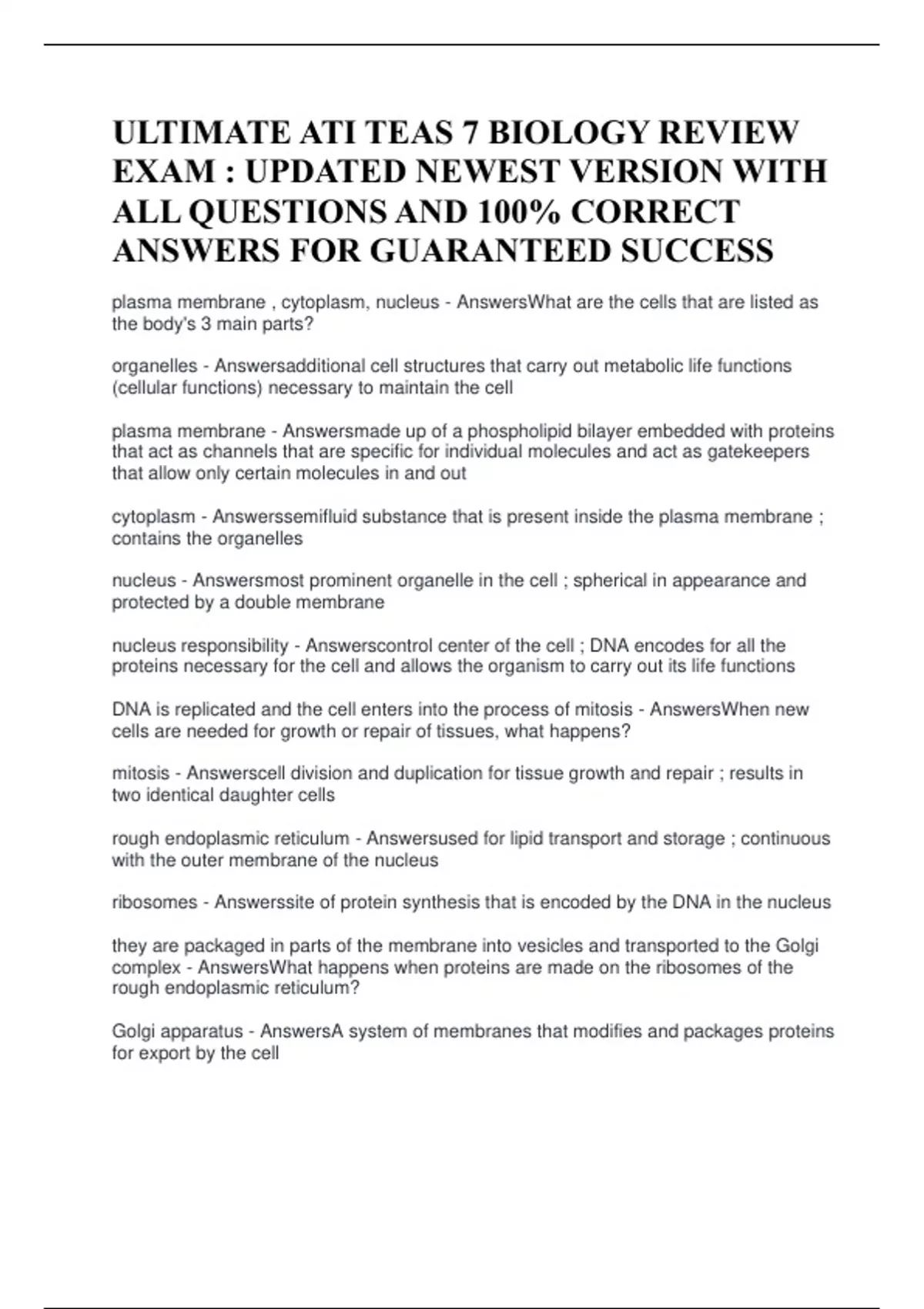 ULTIMATE ATI TEAS 7 BIOLOGY REVIEW EXAM : UPDATED NEWEST VERSION WITH ALL QUESTIONS AND 100% CORRECT ANSWERS FOR GUARANTEED SUCCESS plasma membrane , cytoplasm, nucleus - AnswersWhat are the cells that are listed as the body's 3 main parts? organelles - Answersadditional cell structures that carry out metabolic life functions (cellular functions) necessary to maintain the cell plasma membrane - Answersmade up of a phospholipid bilayer embedded with proteins that act as channels that are specific for individual molecules and act as gatekeepers that allow only certain molecules in and out cytoplasm - Answerssemifluid substance that is present inside the plasma membrane ; contains the organelles nucleus - Answersmost prominent organelle in the cell ; spherical in appearance and protected by a double membrane nucleus responsibility - Answerscontrol center of the cell ; DNA encodes for all the proteins necessary for the cell and allows the organism to carry out its life functions DNA is replicated and the cell enters into the process of mitosis - AnswersWhen new cells are needed for growth or repair of tissues, what happens? mitosis - Answerscell division and duplication for tissue growth and repair ; results in two identical daughter cells rough endoplasmic reticulum - Answersused for lipid transport and storage ; continuous with the outer membrane of the nucleus ribosomes - Answerssite of protein synthesis that is encoded by the DNA in the nucleus they are packaged in parts of the membrane into vesicles and transported to the Golgi complex - AnswersWhat happens when proteins are made on the ribosomes of the rough endoplasmic reticulum? Golgi apparatus - AnswersA system of membranes that modifies and packages proteins for export by the cell