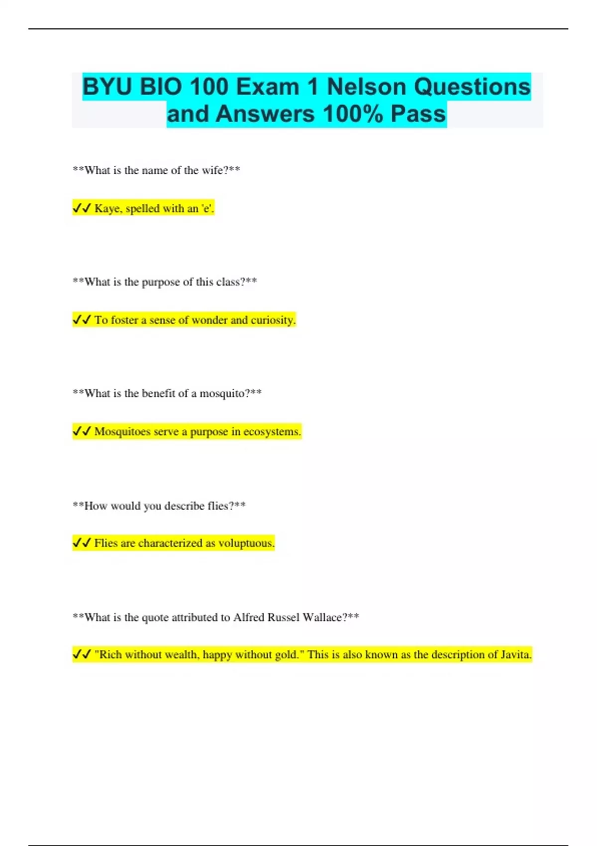 BYU BIO 100 Exam 1 Nelson Questions and Answers 100% Pass **What is the name of the wife?** Kaye, spelled with an 'e'. **What is the purpose of this class?** To foster a sense of wonder and curiosity. **What is the benefit of a mosquito?** Mosquitoes serve a purpose in ecosystems. **How would you describe flies?** Flies are characterized as voluptuous. **What is the quote attributed to Alfred Russel Wallace?** "Rich without wealth, happy without gold." This is also known as the description of Javita. **What is the rule of the tinkerer?** "Save the pieces" is the guiding principle. **Why is it said that God loves beetles?** Because beetles are obedient creatures. **What do larvae consume?** Larvae feed on food sources. **Define pupa.** Pupa refers to an insect in its inactive, immature form, often enclosed in a cocoon. **What is Sacred Datura?** It's a hallucinogenic flower that can be lethal. **How would you define life?** Life involves order, cells, growth and development, energy processing, regulation, response to the environment, reproduction, and evolution. **What is the significance of "A River Runs Through It"?** According to Norman Maclean, "Eventually, all things merge into one, and a river runs through it." He reflects on being haunted by waters. **What is the Ray Bradbury quote about?** "Live life at the top of your enthusiasm" is a quote by Ray Bradbury. **What does Mount St. Helens symbolize?** It symbolizes how even the largest mountains can be drastically altered in a short time, encouraging different perspectives on the world. **What is a Berlese Funnel?** It's a device that can be constructed using a milk jug. **What evolutionary phenomenon makes the strangest sound?** Howler monkeys are known for making