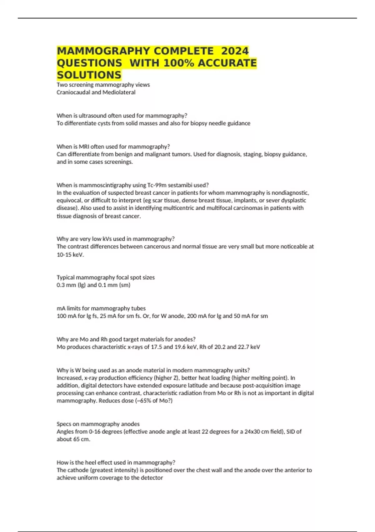 MAMMOGRAPHY COMPLETE 2024 QUESTIONS WITH 100% ACCURATE SOLUTIONS Two screening mammography views Craniocaudal and Mediolateral When is ultrasound often used for mammography? To differentiate cysts from solid masses and also for biopsy needle guidance When is MRI often used for mammography? Can differentiate from benign and malignant tumors. Used for diagnosis, staging, biopsy guidance, and in some cases screenings. When is mammoscintigraphy using Tc-99m sestamibi used? In the evaluation of suspected breast cancer in patients for whom mammography is nondiagnostic, equivocal, or difficult to interpret (eg scar tissue, dense breast tissue, implants, or sever dysplastic disease). Also used to assist in identifying multicentric and multifocal carcinomas in patients with tissue diagnosis of breast cancer. Why are very low kVs used in mammography? The contrast differences between cancerous and normal tissue are very small but more noticeable at 10-15 keV. Typical mammography focal spot sizes 0.3 mm (lg) and 0.1 mm (sm) mA limits for mammography tubes 100 mA for lg fs, 25 mA for sm fs. Or, for W anode, 200 mA for lg and 50 mA for sm Why are Mo and Rh good target materials for anodes? Mo produces characteristic x-rays of 17.5 and 19.6 keV, Rh of 20.2 and 22.7 keV Why is W being used as an anode material in modern mammography units? Increased, x-ray production efficiency (higher Z), better heat loading (higher melting point). In addition, digital detectors have extended exposure latitude and because post-acquisition image processing can enhance contrast, characteristic radiation from Mo or Rh is not as important in digital mammography. Reduces dose (~65% of Mo?) Specs on mammography anodes Angles from 0-16 degrees (effective anode angle at least 22 degrees for a 24x30 cm field), SID of about 65 cm. How is the heel effect used in mammography? The cathode (greatest intensity) is positioned over the chest wall and the anode over the anterior to achieve uniform coverage to the detector What is another reason the x-ray tube is oriented front-back in mammography? It decreases the equipment bulk near the patient's head. The anode is kept at ground and the cathode is set to highest negative voltage to reduce off-focal radiation. "Half-field" x-ray beam geometry Used to avoid exposure of patients' torsos and maximize breast tissue near chest wall imaged. Achieved by fixed collimation at the x-ray tube head. The central axis of the x-ray beam is directed at the chest wall edge of the receptor and perpendicular to the pl