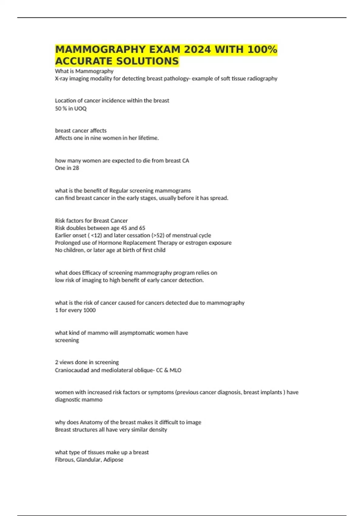 MAMMOGRAPHY EXAM 2024 WITH 100% ACCURATE SOLUTIONS What is Mammography X-ray imaging modality for detecting breast pathology- example of soft tissue radiography Location of cancer incidence within the breast 50 % in UOQ breast cancer affects Affects one in nine women in her lifetime. how many women are expected to die from breast CA One in 28 what is the benefit of Regular screening mammograms can find breast cancer in the early stages, usually before it has spread. Risk factors for Breast Cancer Risk doubles between age 45 and 65 Earlier onset ( <12) and later cessation (>52) of menstrual cycle Prolonged use of Hormone Replacement Therapy or estrogen exposure No children, or later age at birth of first child what does Efficacy of screening mammography program relies on low risk of imaging to high benefit of early cancer detection. what is the risk of cancer caused for cancers detected due to mammography 1 for every 1000 what kind of mammo will asymptomatic women have screening 2 views done in screening Craniocaudad and mediolateral oblique- CC & MLO women with increased risk factors or symptoms (previous cancer diagnosis, breast implants ) have diagnostic mammo why does Anatomy of the breast makes it difficult to image Breast structures all have very similar density what type of tissues make up a breast Fibrous, Glandular, Adipose where do where 80% of breast cancers form Glandular tissue which breast tissue is MOST sensitive to radiation Glandular on a mammogram , Adipose tissue appears dark