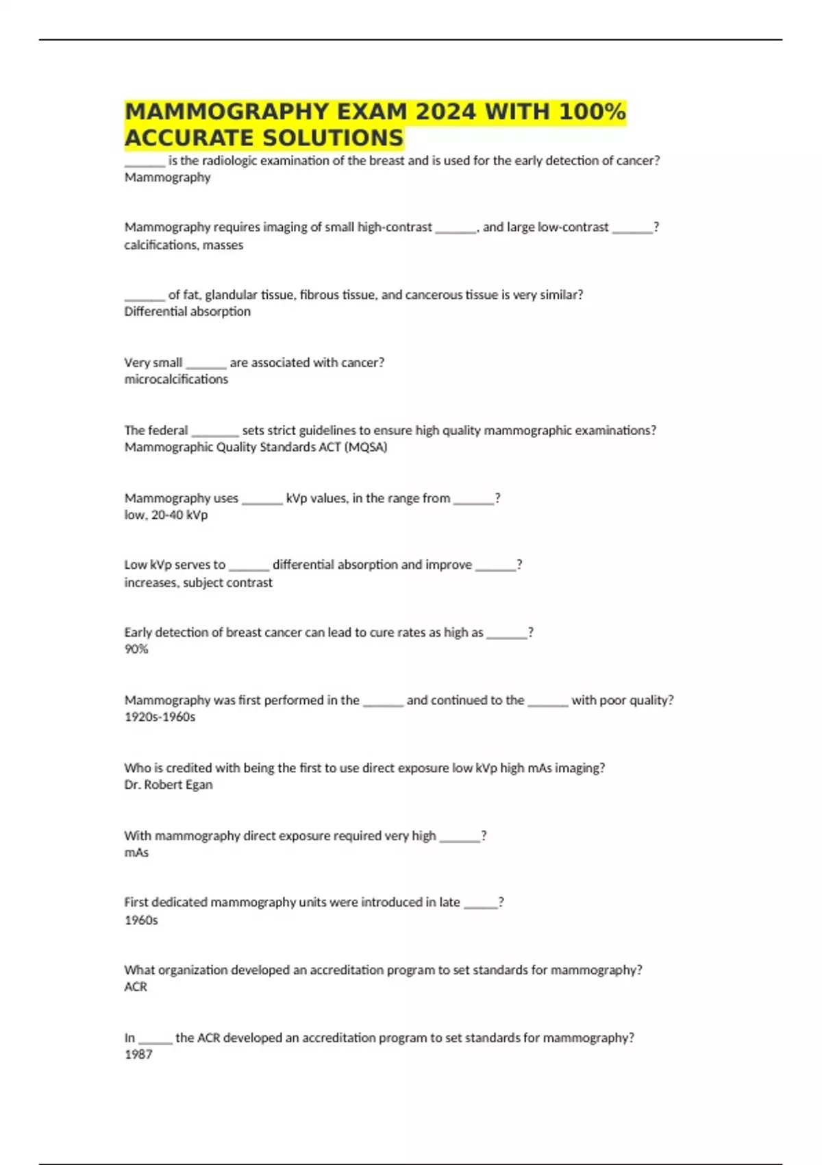 MAMMOGRAPHY EXAM 2024 WITH 100% ACCURATE SOLUTIONS ______ is the radiologic examination of the breast and is used for the early detection of cancer? Mammography Mammography requires imaging of small high-contrast ______, and large low-contrast ______? calcifications, masses ______ of fat, glandular tissue, fibrous tissue, and cancerous tissue is very similar? Differential absorption Very small ______ are associated with cancer? microcalcifications The federal _______ sets strict guidelines to ensure high quality mammographic examinations? Mammographic Quality Standards ACT (MQSA) Mammography uses ______ kVp values, in the range from ______? low, 20-40 kVp Low kVp serves to ______ differential absorption and improve ______? increases, subject contrast Early detection of breast cancer can lead to cure rates as high as ______? 90% Mammography was first performed in the ______ and continued to the ______ with poor quality? 1920s-1960s Who is credited with being the first to use direct exposure low kVp high mAs imaging? Dr. Robert Egan With mammography direct exposure required very high ______? mAs First dedicated mammography units were introduced in late _____? 1960s What organization developed an accreditation program to set standards for mammography? ACR In _____ the ACR developed an accreditation program to set standards for mammography? 1987 In _____, the federal government enacted MQSA to establish standards for facilities? 1994 In early 2000, ______ was approved for sale in the U.S? digital mammography What are 2 types of examinations in mammography? Screening mammography, Diagnostic mammography _______ examination is performed on symptomatic women, or women whose screening demonstrates suspicious areas that need further evaluation. Diagnostic mammography