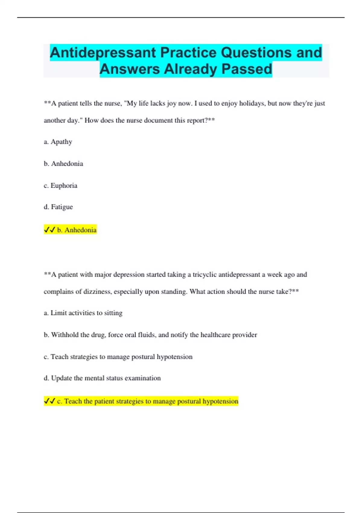 Antidepressant Practice Questions and Answers Already Passed **A patient tells the nurse, "My life lacks joy now. I used to enjoy holidays, but now they're just another day." How does the nurse document this report?** a. Apathy b. Anhedonia c. Euphoria d. Fatigue b. Anhedonia **A patient with major depression started taking a tricyclic antidepressant a week ago and complains of dizziness, especially upon standing. What action should the nurse take?** a. Limit activities to sitting b. Withhold the drug, force oral fluids, and notify the healthcare provider c. Teach strategies to manage postural hypotension d. Update the mental status examination c. Teach the patient strategies to manage postural hypotension **A patient on imipramine (Tofranil) 200 mg qhs for depression presents with urinary retention. What should prompt the nurse to consult the healthcare provider?** a. Dry mouth b. Blurred vision c. Nasal congestion d. Urinary retention d. Urinary retention **A patient begins SSRI therapy for depression. What information should the nurse provide about potential side effects?** a. Restrict sodium intake b. Minimize exposure to sunlight c. Report increased suicidal thoughts d. Maintain a tyramine-free diet c. Report increased suicidal thoughts **A nurse educates a patient on a tyramine-restricted diet. Which meal choice would be suitable for the patient?** a. Macaroni and cheese, hot dogs, banana bread, caffeinated coffee b. Mashed potatoes, ground beef patty, corn, green beans, apple pie c. Avocado salad, ham, creamed potatoes, asparagus, chocolate cake d. Noodles with cheddar cheese sauce, smoked sausage, lettuce salad, yeast rolls b. Mashed potatoes, ground beef patty, corn, green beans, apple pie **After teaching a patient about phenelzine (Nardil), what behavior indicates effective learning? The patient:** a. Monitors sodium intake and weight daily b. Wears support stockings and elevates legs when sitting c. Can identify foods high in selenium to avoid d. Consults with a pharmacist when choosing over-the-counter medications d. Consults with a pharmacist when choosing over-the-counter medications **A patient on 300 mg amitriptyline (Elavil) daily for depression stops abruptly and experiences cold sweats, nausea, rapid heartbeat, and nightmares. What should the nurse advise?** a. Go to the nearest emergency department immediately b. Take two aspirin and drink plenty of fluids c. Take a dose of the antidepressant and visit the clinic d. Resume antidepressants for two weeks, then stop again c. Take a dose of your antidepressant now and come to the clinic to see the healthcare provider A patient diagnosed with major depression refuses solid foods. In order to meet nutritional needs, which beverage will the nurse offer to this patient? a. Tomato juice b. Orange juice c. Hot tea d. Milk d. Milk A patient diagnosed with major depression began taking escitalopram (Lexapro) 5 days ago. The patient now says, "This medicine isn't working." The nurse's best intervention would be to: a. discuss with the health care provider