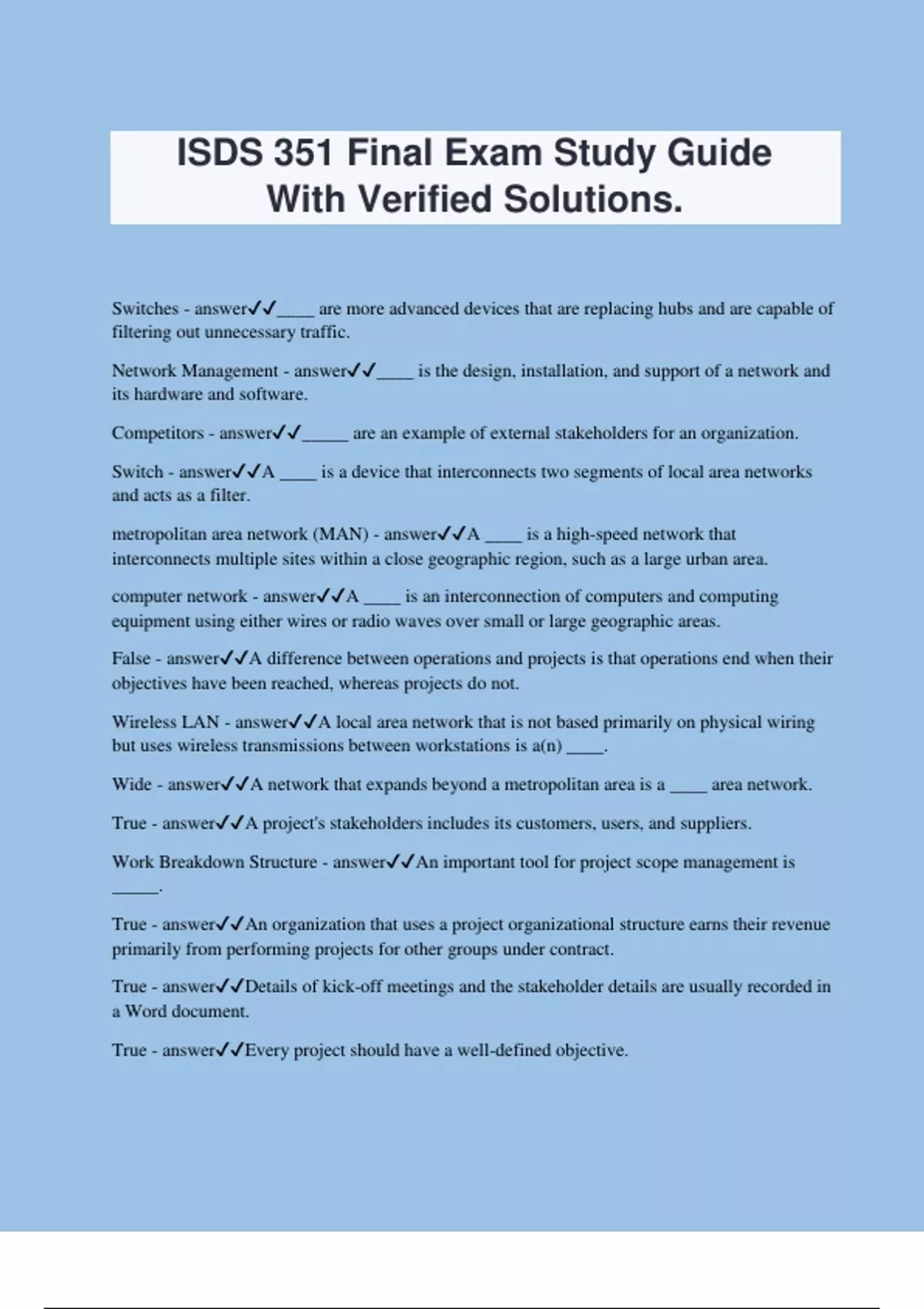 ISDS 351 Final Exam Study Guide With Verified Solutions. Switches - answer____ are more advanced devices that are replacing hubs and are capable of filtering out unnecessary traffic. Network Management - answer____ is the design, installation, and support of a network and its hardware and software. Competitors - answer_____ are an example of external stakeholders for an organization. Switch - answerA ____ is a device that interconnects two segments of local area networks and acts as a filter. metropolitan area network (MAN) - answerA ____ is a high-speed network that interconnects multiple sites within a close geographic region, such as a large urban area. computer network - answerA ____ is an interconnection of computers and computing equipment using either wires or radio waves over small or large geographic areas. False - answerA difference between operations and projects is that operations end when their objectives have been reached, whereas projects do not. Wireless LAN - answerA local area network that is not based primarily on physical wiring but uses wireless transmissions between workstations is a(n) ____. Wide - answerA network that expands beyond a metropolitan area is a ____ area network. True - answerA project's stakeholders includes its customers, users, and suppliers. Work Breakdown Structure - answerAn important tool for project scope management is _____. True - answerAn organization that uses a project organizational structure earns their revenue primarily from performing projects for other groups under contract. True - answerDetails of kick-off meetings and the stakeholder details are usually recorded in a Word document. True - answerEvery project should have a well-defined objective.