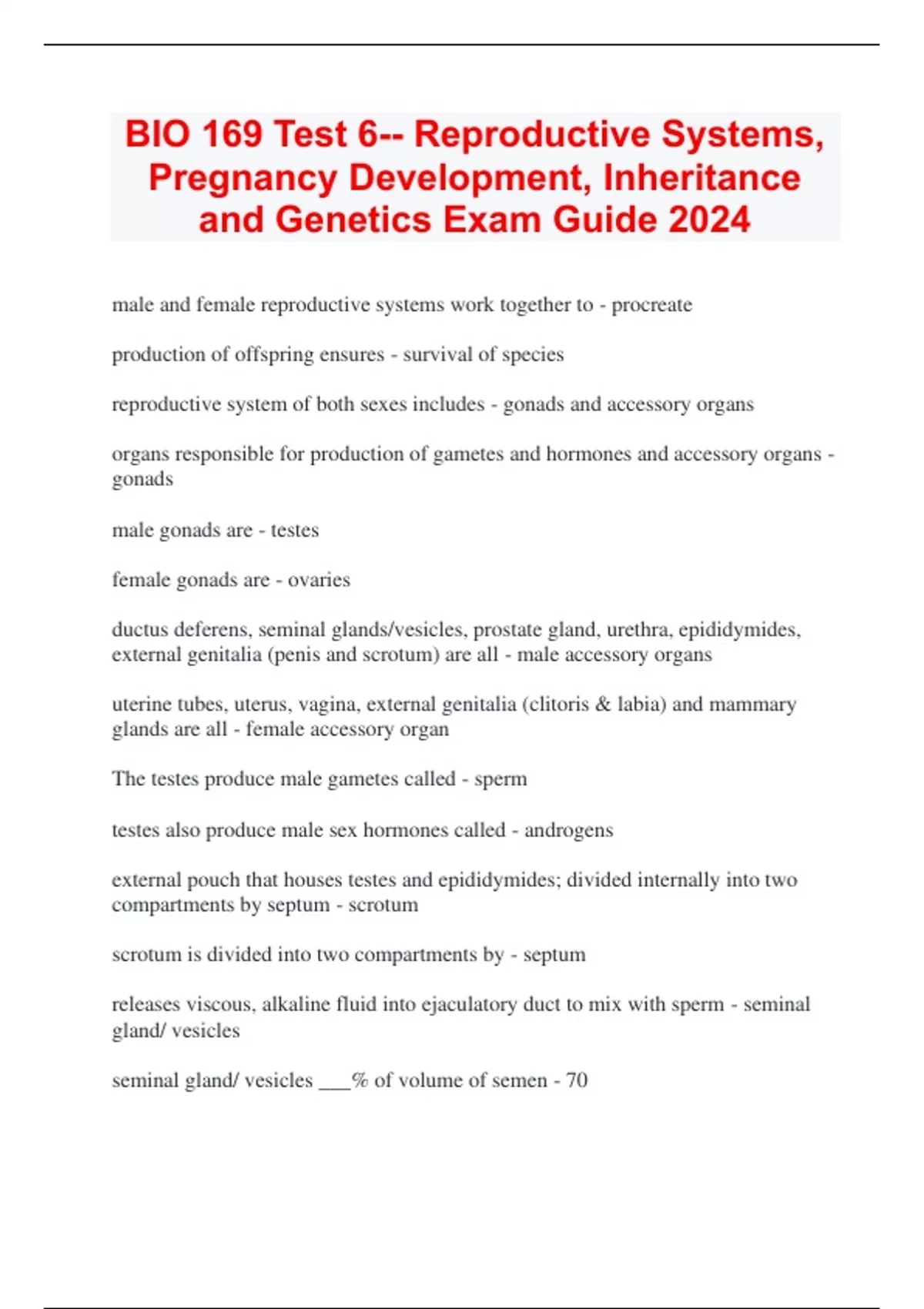 BIO 169 Test 6-- Reproductive Systems, Pregnancy Development, Inheritance and Genetics Exam Guide 2024