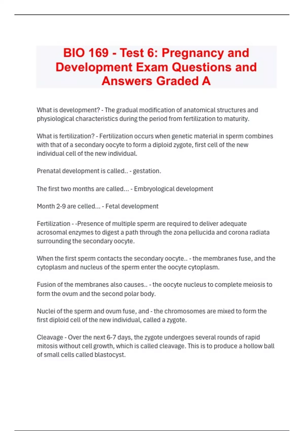 BIO 169 - Test 6: Pregnancy and Development Exam Questions and Answers Graded A