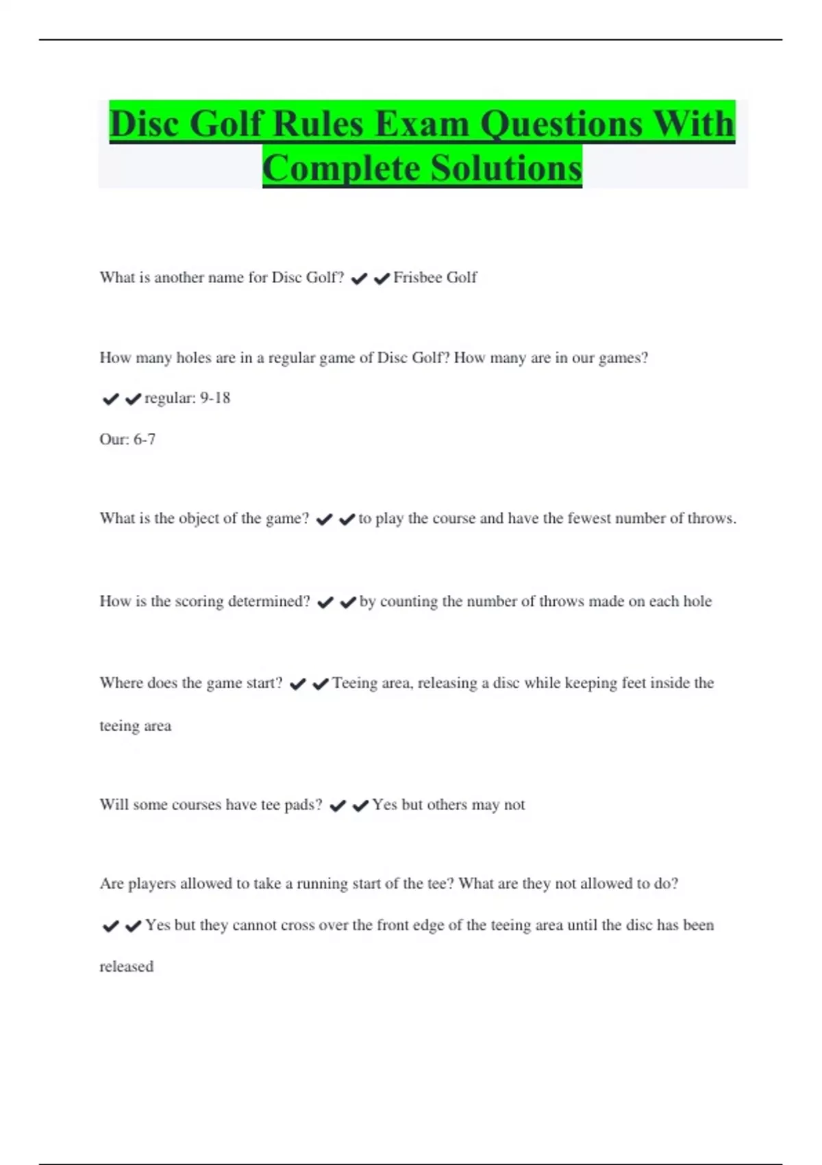 Disc Golf Rules Exam Questions With Complete Solutions What is another name for Disc Golf? ️️Frisbee Golf How many holes are in a regular game of Disc Golf? How many are in our games? ️️regular: 9-18 Our: 6-7 What is the object of the game? ️️to play the course and have the fewest number of throws. How is the scoring determined? ️️by counting the number of throws made on each hole Where does the game start? ️️Teeing area, releasing a disc while keeping feet inside the teeing area Will some courses have tee pads? ️️Yes but others may not