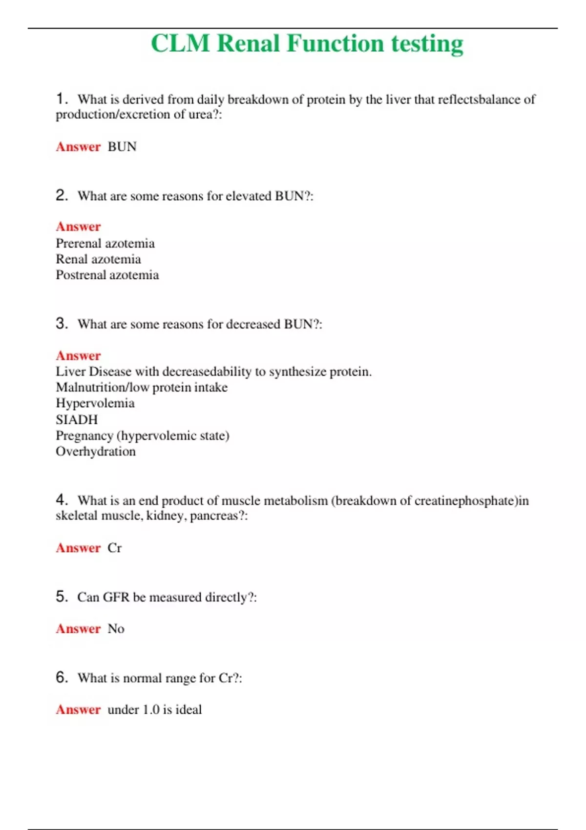 CLM Renal Function testing (Latest 2024) Questions With Complete Grade A+ Answers
