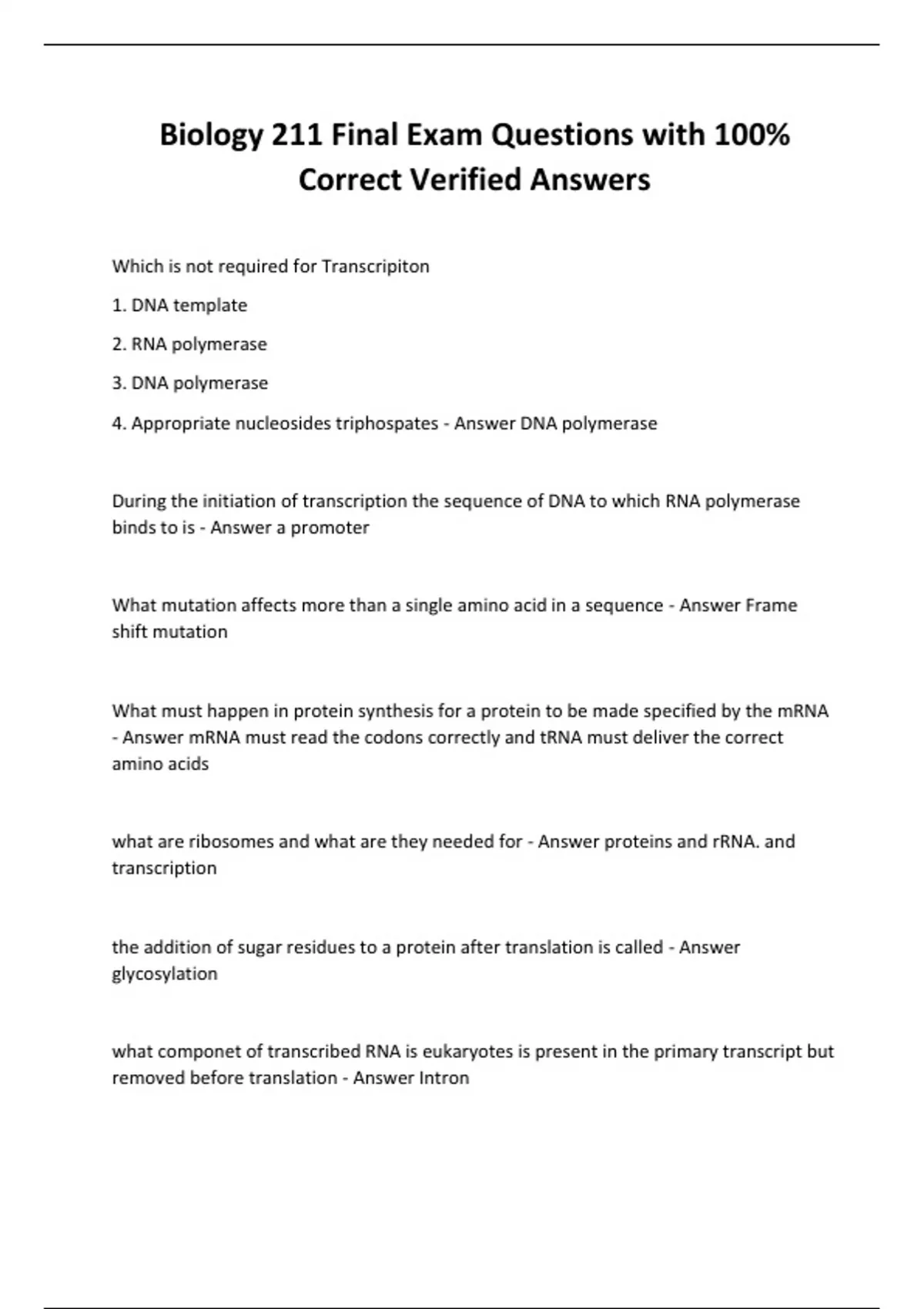 Biology 211 Final Exam Questions with 100% Correct Verified Answers Which is not required for Transcripiton 1. DNA template 2. RNA polymerase 3. DNA polymerase 4. Appropriate nucleosides triphospates - Answer DNA polymerase During the initiation of transcription the sequence of DNA to which RNA polymerase binds to is - Answer a promoter What mutation affects more than a single amino acid in a sequence - Answer Frame shift mutation What must happen in protein synthesis for a protein to be made specified by the mRNA - Answer mRNA must read the codons correctly and tRNA must deliver the correct amino acids what are ribosomes and what are they needed for - Answer proteins and rRNA. and transcription the addition of sugar residues to a protein after translation is called - Answer glycosylation what componet of transcribed RNA is eukaryotes is present in the primary transcript but removed before translation - Answer Intron pumping antibiotics out of the cytoplasm and keeping it free of it is known as what - Answer active transport Do hormones b elong to steriods - Answer yes do hormones belong to proteins - Answer yes do hormones belong to carbs - Answer no do hormones belong to amines - Answer yes what would happen if a white blood cell is place in a hypertonic solution - Answer it will shrivel what makes ions hydrophilic - Answer there charge which lipids are found in an animal cell membrane - Answer phospholipids and cholesterol juvenile hormone is used in insects because - Answer they fail to develop into adults the glyco in glycollipi d is found where - Answer on the exterior face of the cell membrane the movement from a high concentration to a low concentration is - Answer facilitated diffusion
