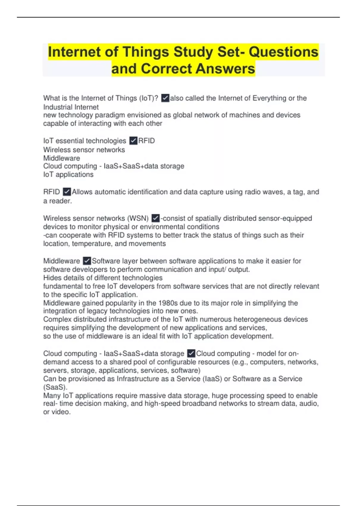 What is the Internet of Things (IoT)? also called the Internet of Everything or the Industrial Internet new technology paradigm envisioned as global network of machines and devices capable of interacting with each other IoT essential technologies RFID Wireless sensor networks Middleware Cloud computing - IaaS+SaaS+data storage IoT applications RFID Allows automatic identification and data capture using radio waves, a tag, and a reader. Wireless sensor networks (WSN) -consist of spatially distributed sensor-equipped devices to monitor physical or environmental conditions -can cooperate with RFID systems to better track the status of things such as their location, temperature, and movements Middleware Software layer between software applications to make it easier for software developers to perform communication and input/ output. Hides details of different technologies fundamental to free IoT developers from software services that are not directly relevant to the specific IoT application. Middleware gained popularity in the 1980s due to its major role in simplifying the integration of legacy technologies into new ones. Complex distributed infrastructure of the IoT with numerous heterogeneous devices requires simplifying the development of new applications and services, so the use of middleware is an ideal fit with IoT application development. Cloud computing - IaaS+SaaS+data storage Cloud computing - model for on-demand access to a shared pool of configurable resources (e.g., computers, networks, servers, storage, applications, services, software) Can be provisioned as Infrastructure as a Service (IaaS) or Software as a Service (SaaS). Many IoT applications require massive data storage, huge processing speed to enable real- time decision making, and high-speed broadband networks to stream data, audio, or video.
