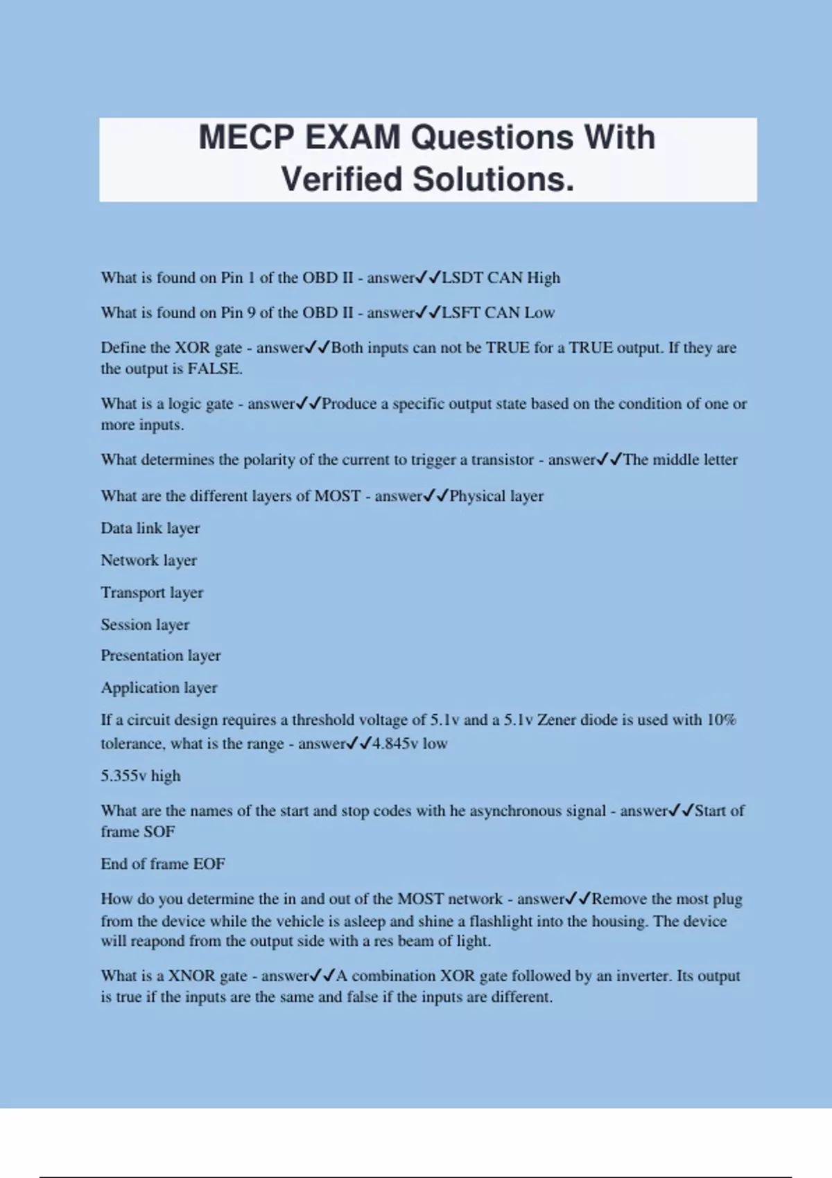 MECP EXAM Questions With Verified Solutions. What is found on Pin 1 of the OBD II - answerLSDT CAN High What is found on Pin 9 of the OBD II - answerLSFT CAN Low Define the XOR gate - answerBoth inputs can not be TRUE for a TRUE output. If they are the output is FALSE. What is a logic gate - answerProduce a specific output state based on the condition of one or more inputs. What determines the polarity of the current to trigger a transistor - answerThe middle letter What are the different layers of MOST - answerPhysical layer Data link layer Network layer Transport layer Session layer Presentation layer Application layer If a circuit design requires a threshold voltage of 5.1v and a 5.1v Zener diode is used with 10% tolerance, what is the range - answer4.845v low 5.355v high What are the names of the start and stop codes with he asynchronous signal - answerStart of frame SOF End of frame EOF How do you determine the in and out of the MOST network - answerRemove the most plug from the device while the vehicle is asleep and shine a flashlight into the housing. The device will reapond from the output side with a res beam of light. What is a XNOR gate - answerA combination XOR gate followed by an inverter. Its output is true if the inputs are the same and false if the inputs are different. What are the two most common forms of logic gate arrays implemented into integrated circuits - answerTransistor transistor logic TTL Complentary Metal Oxide Semiconductor CMOS Describe MOST 25 - answerThe device will have constant power, chassis ground, and usually a wake up diagnostic wire. Typical colors are orange or green. Max speed of 25M baud and 512 bits What does the bias on the base of a transistor control. - answerThe amount of current flowing between the emitter and collector. When using a Zener diode, where should a fuse be placed for circuit protection? - answerAfter the Zener diode Where does the arrow point in a bi polar transistor? - answerToward the N type material What is Zener voltage? - answerThe diode's voltage threshold. Also known as avalanche voltage. What is MOST 50? - answerCarried over UTP or unshielded twisted pa contains one pair of twisted wires for input and a second pair for output. The pairs have a different teist rate. Max speed is 50 M baud and 1024 bits. What is SAE1979 and ISO15031-5 - answerSpecifies a set of standard messages that can be used by scan tools to obtain OBD II data from a vehicle. What is synchronous? - answerData signals that are constant, meaning the signal never astops as long as the computers are active. What is MOST 150 - answer150 M baud and 3072 bits Enables an ethernet channel in addition to the control message channel, streaming data channel and packet data channel. What does P stand for in an OBD II diagnostic code? - answerPowertrain What does the power supply of a mobile amplifier do? - answerSwitches battery voltage to a higher rail voltage What is a NOT gate - answerThe output is opposite of the input. If the input is TRUE then the output is FALSE. What are the seven basic logic gates - answerAND OR XOR NOT NAND NOR XNOR What is a MOSFET and what are its parts? - answerMetal Oxide Semiconductor Field Effect Transistor 1 Gate 2 Source 3 Drain What is needed to work around a Hybrid vehicles Orange covered wiring? - answerInsulated Class 0 electrical linemans gloves What is OBD II and what does it do? - answerSecond generation On Board Diagnostics created in 1996 to provide technicisns eith a universal set of basic fiagnodtic capabilities. What is hole flow? - answerThe opposite direction of electron flow. Are electrons positively or negatively charged? - answerNegatively What is a Zener Diode and what is its function? - answerA special kind of diode based on the initial work of Dr. Carl Zener in 1934. It functions as a voltage regulator when reverse biased. What is Pin 2 of the OBD II - answerJ1850 Bus+ (VPW and PWM) What is Pin 4 of the OBD II - answerChassis Ground What is Pin 5 of the OBD II - answerSignal Ground What is Pin 6 of the OBD II - answerCan High (J-2284) What is Pin 7 of the OBD II - answerISO9141-2 K Line of KWP What is Pin 10 of the OBD II - answerJ1850 Bus (PWM only) What is Pin 14 of the OBD II - answerCan Low (J-2284) What is Pin 15 of the OBD II - answerISO 9141-2L Line or KWP What is Pin 16 of the OBD II - answerBattery Power