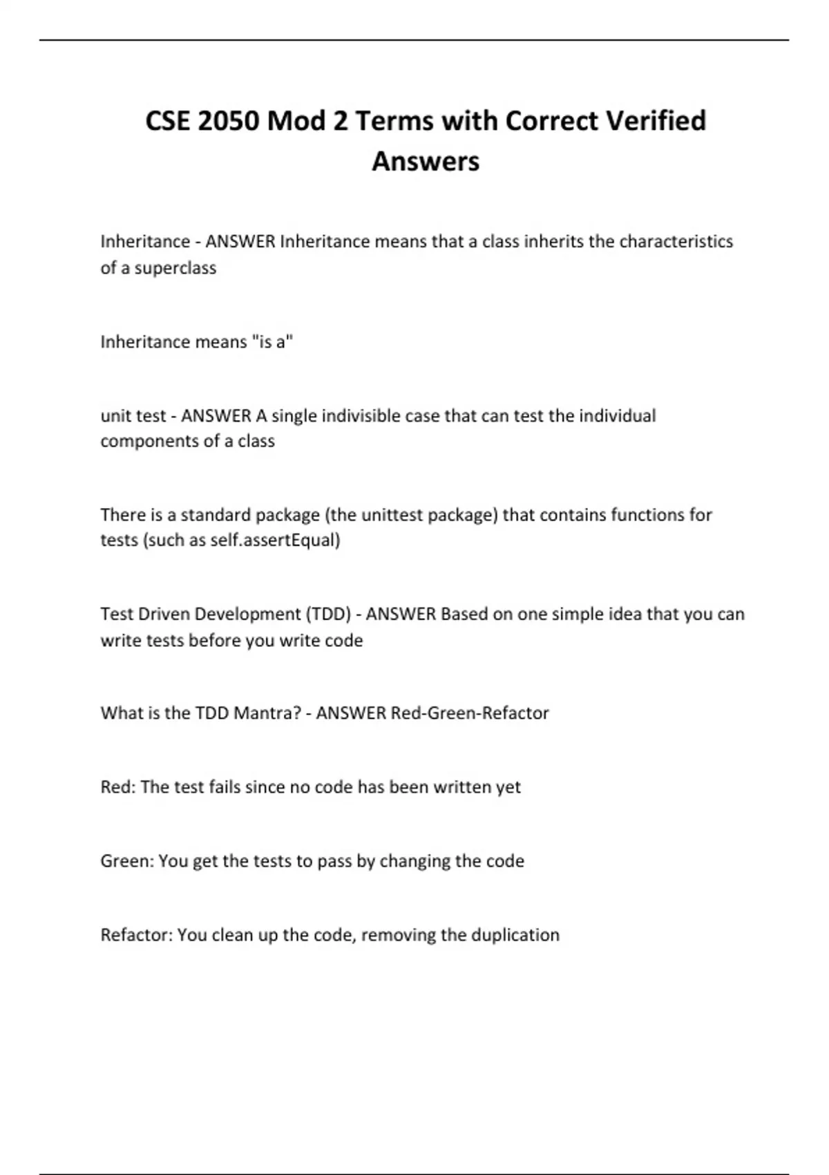 nheritance - ANSWER Inheritance means that a class inherits the characteristics of a superclass Inheritance means "is a" unit test - ANSWER A single indivisible case that can test the individual components of a class