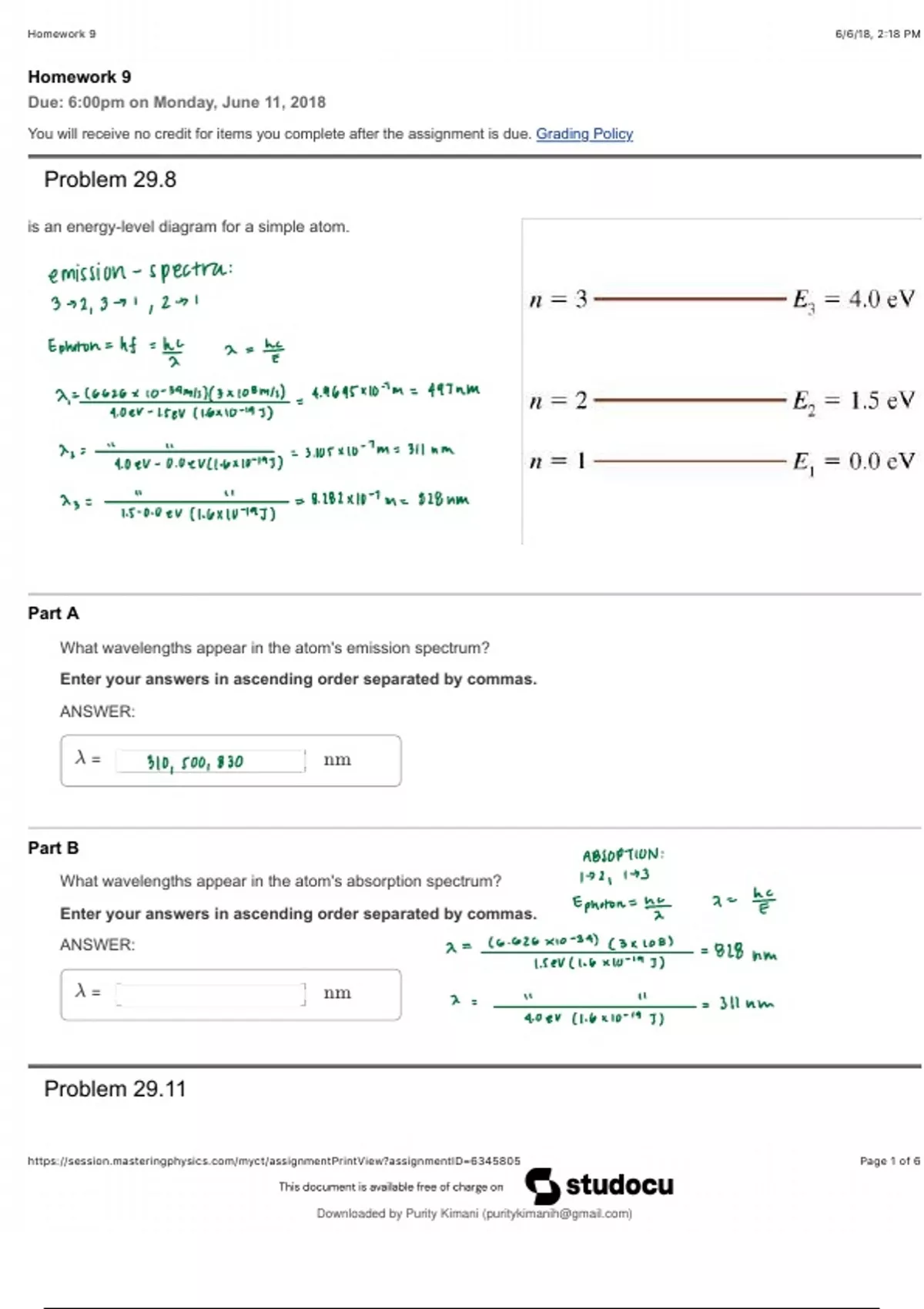 is an energy-level diagram for a simple atom. Part A What wavelengths appear in the atom's emission spectrum? Enter your answers in ascending order separated by commas. ANSWER: Part B What wavelengths appear in the atom's absorption spectrum? Enter your answers in ascending order separated by commas. ANSWER: Problem 29.11 λ = nm λ = nm emission spectra 372,3 71 2 I Ephotonsht x h 2 16.626 1034ms 3 108mis 4.969510Tm 497mm oer liter 1.61019J